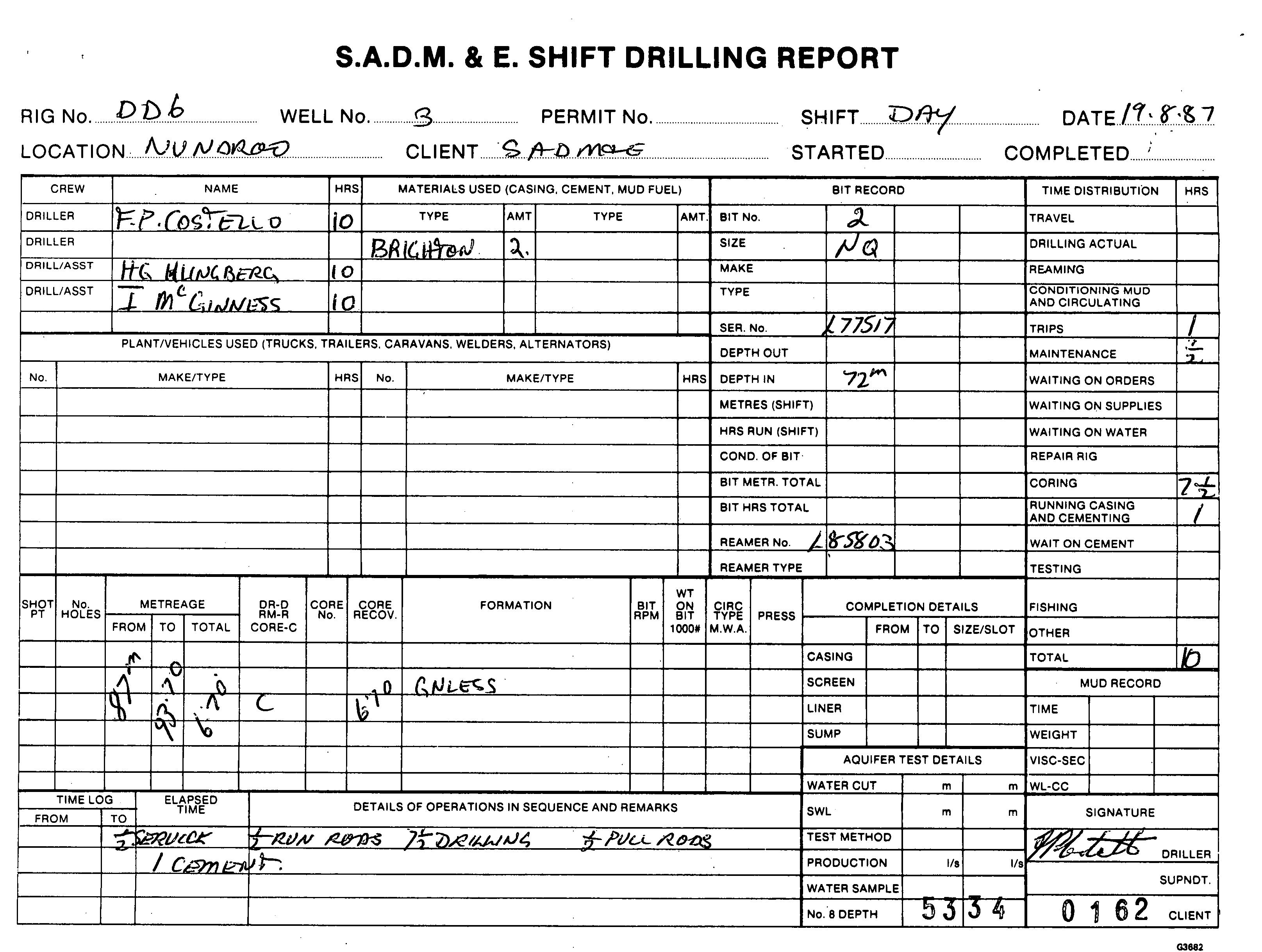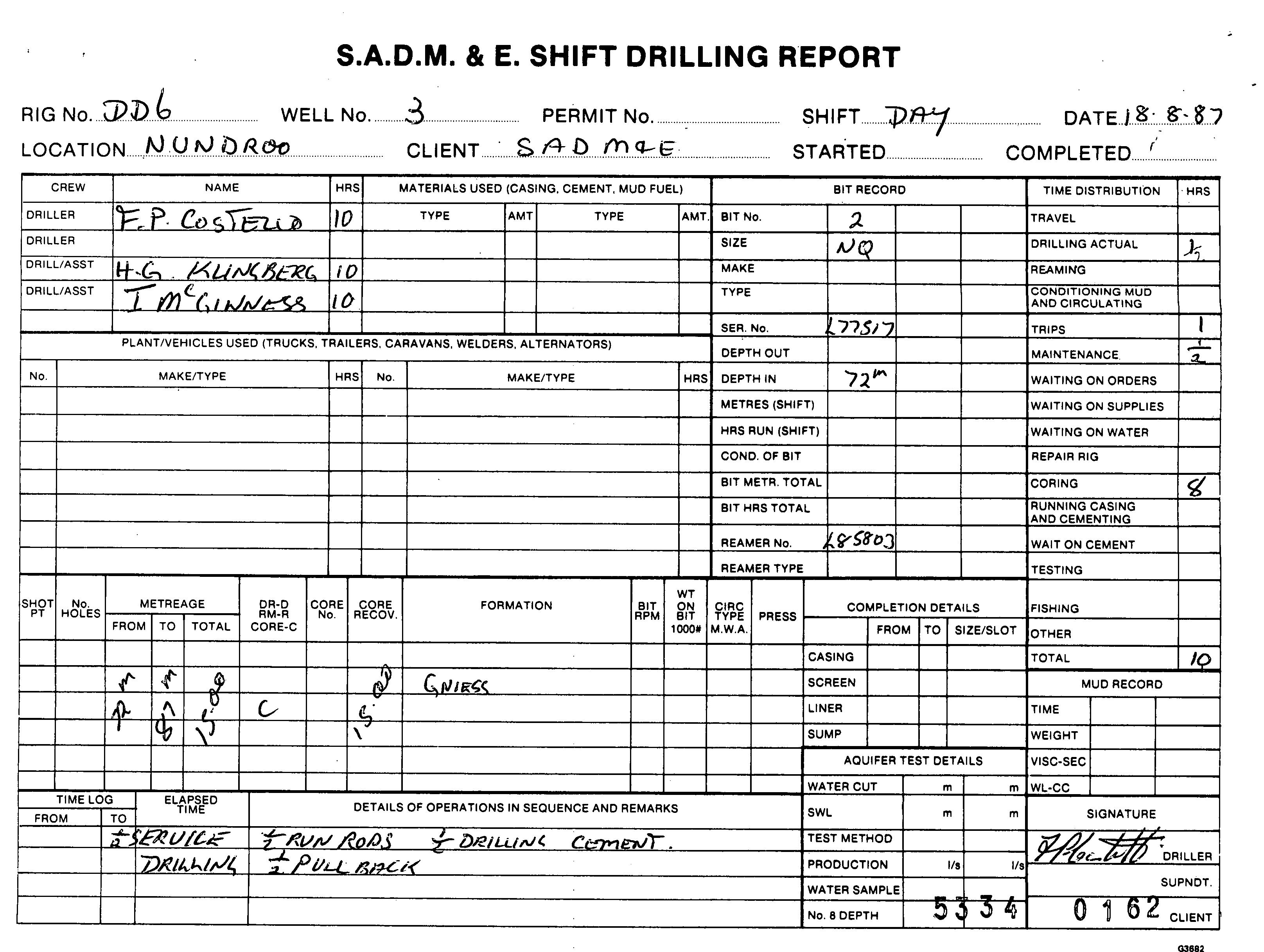 | 72 | 73 | Drill core | DALY, S.J. | 27/11/1987 |