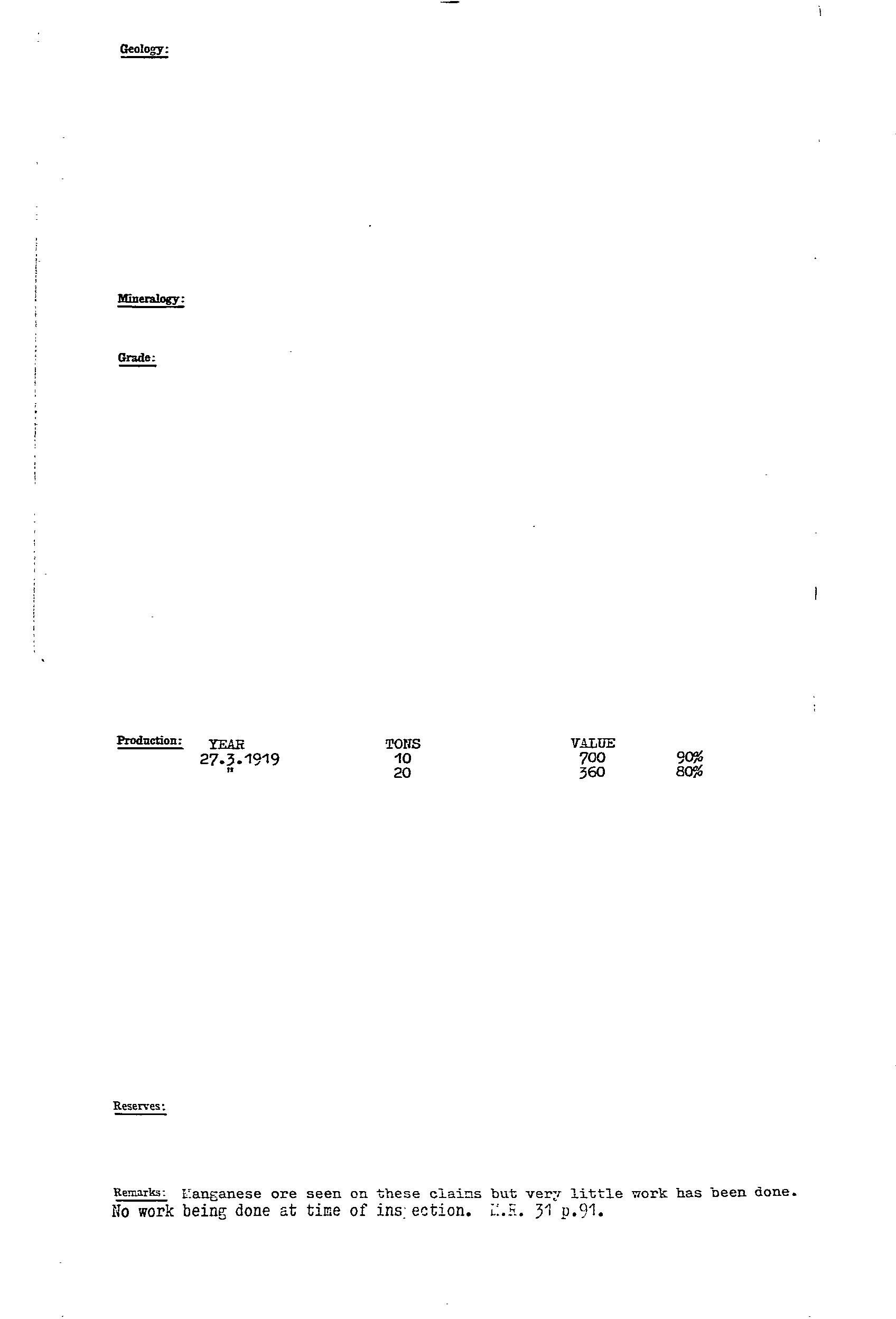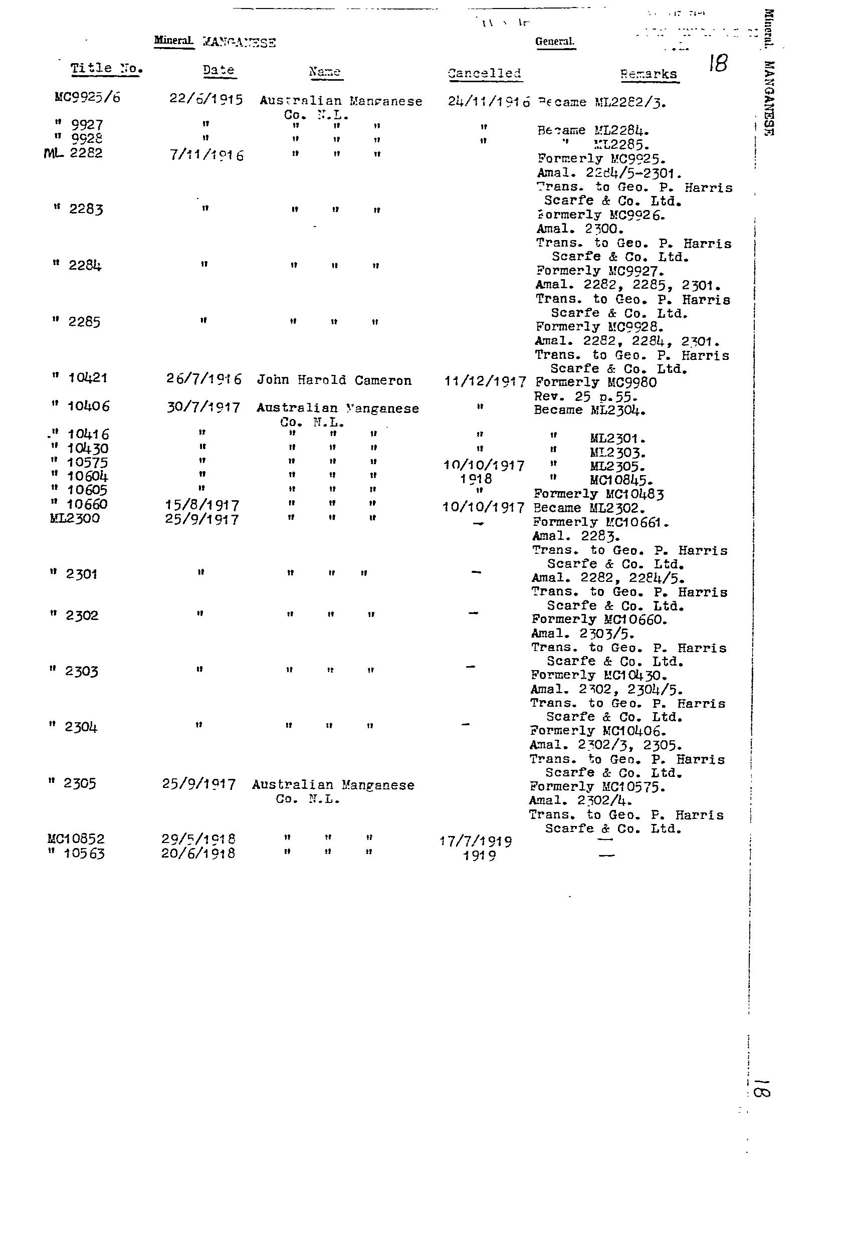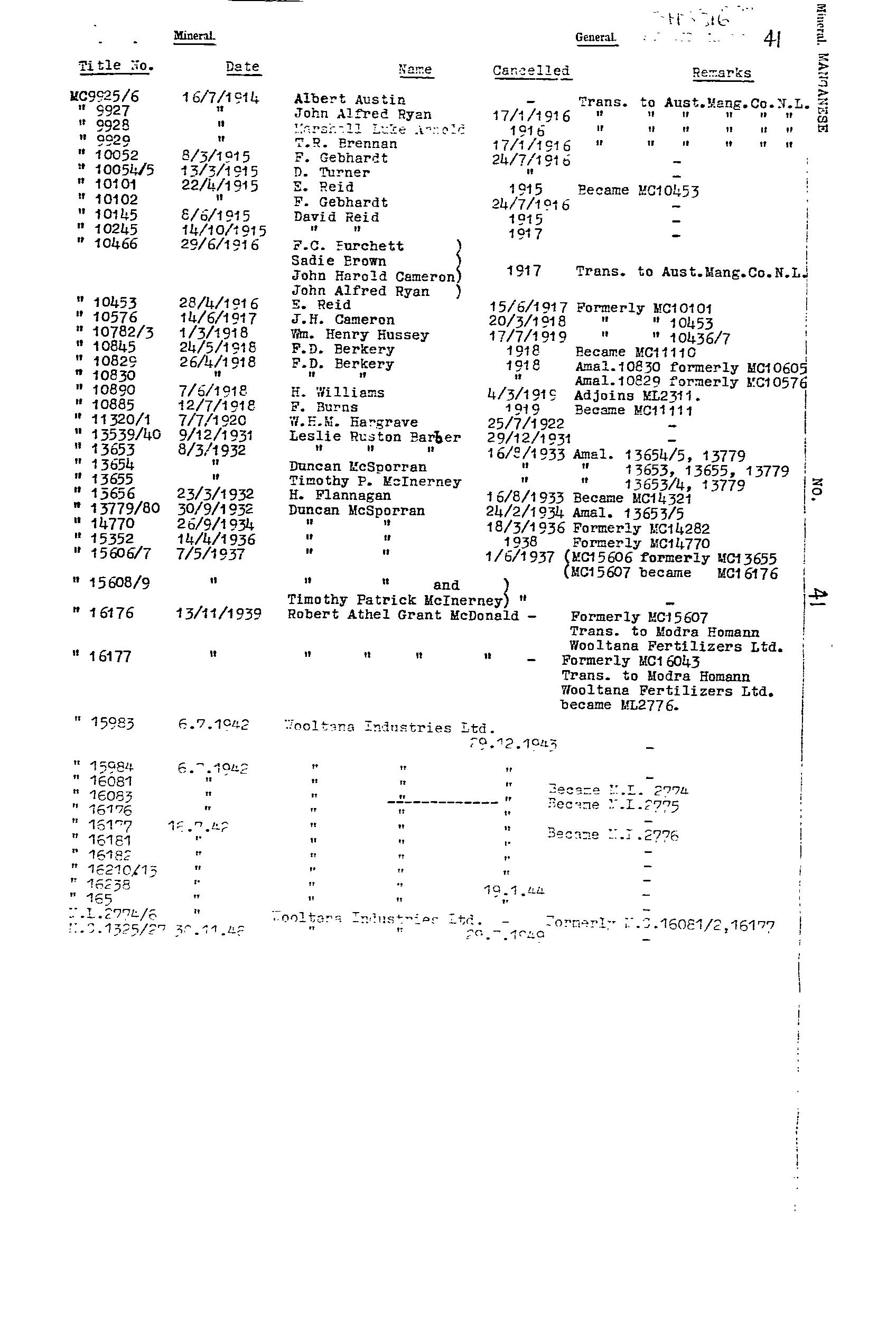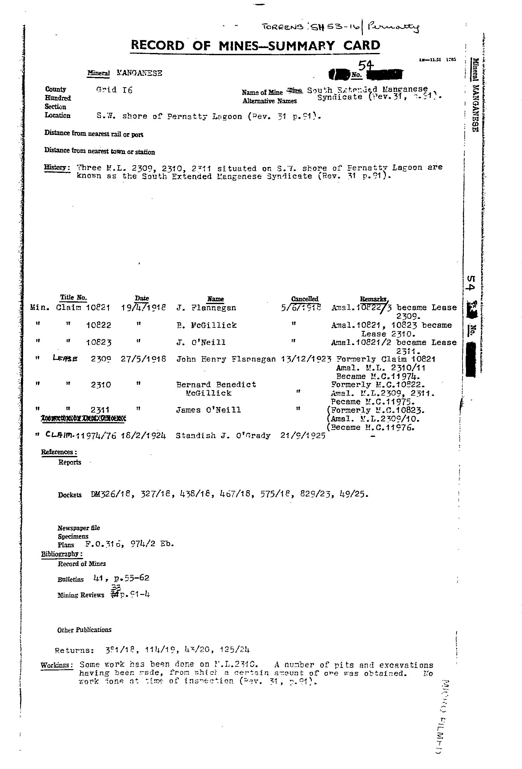 AUSTRALIAN MANGANESE; BIG; BLUE; EAST WEST MINERAL CO. NL; F.R.J. MANGANESE CLAIM; HORSE SHOE; LAKE; MAGAZINE 1; MAGAZINE 2; MAIN; MCGREGORS LAKE; ML 2774; ML 2776; ML 5787; SOUTH EXTENDED MANGANESE SYNDICATE; TRIBUTORS; WASHER