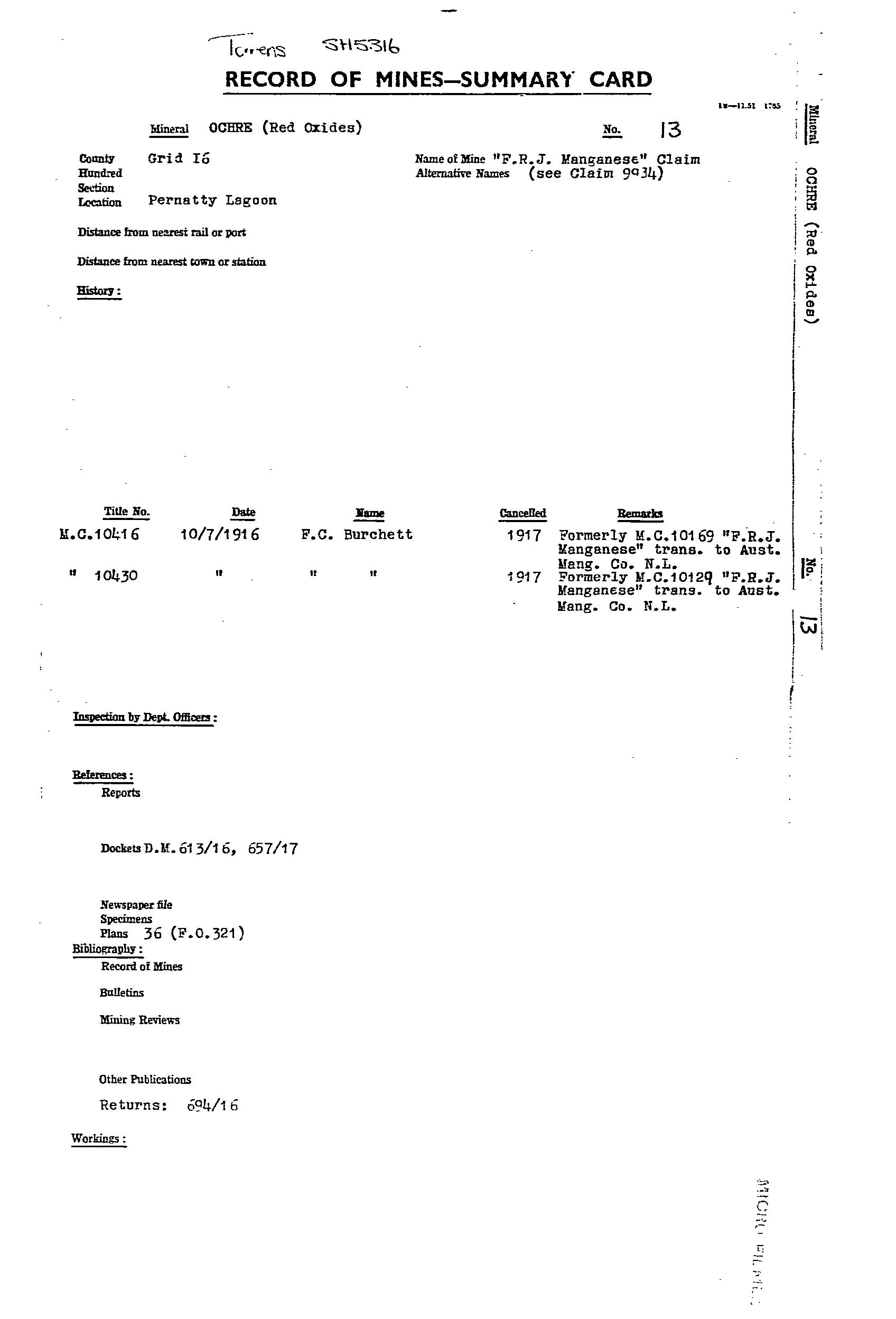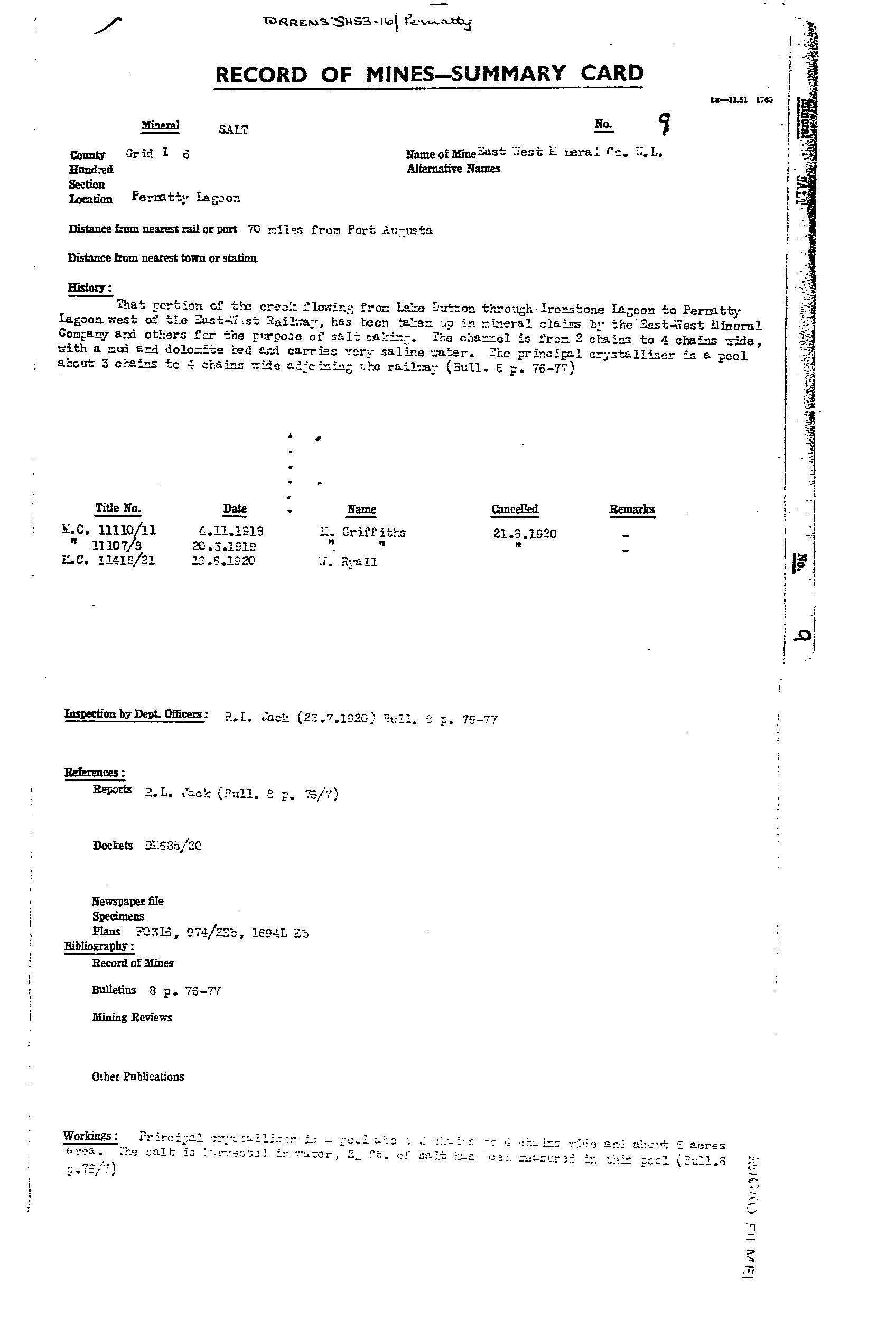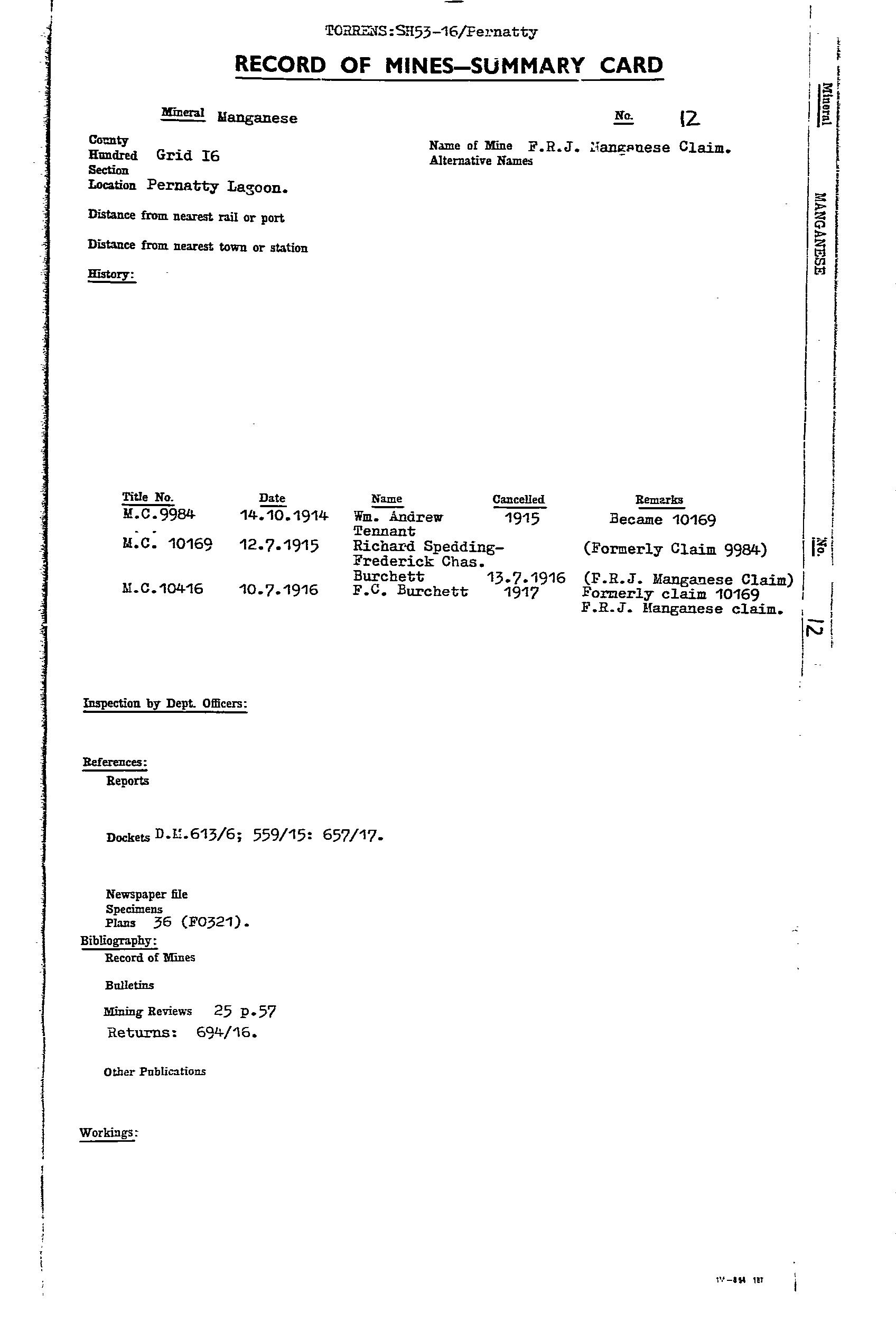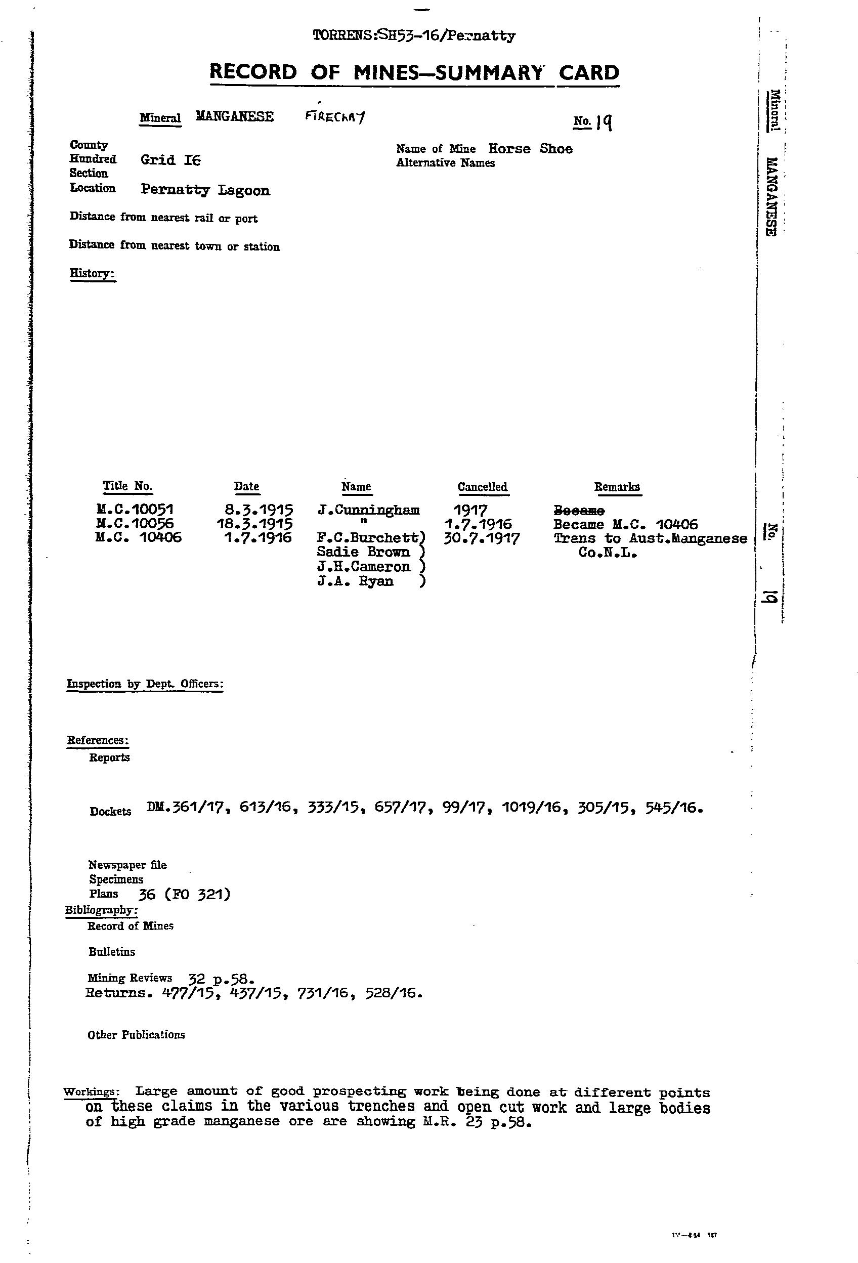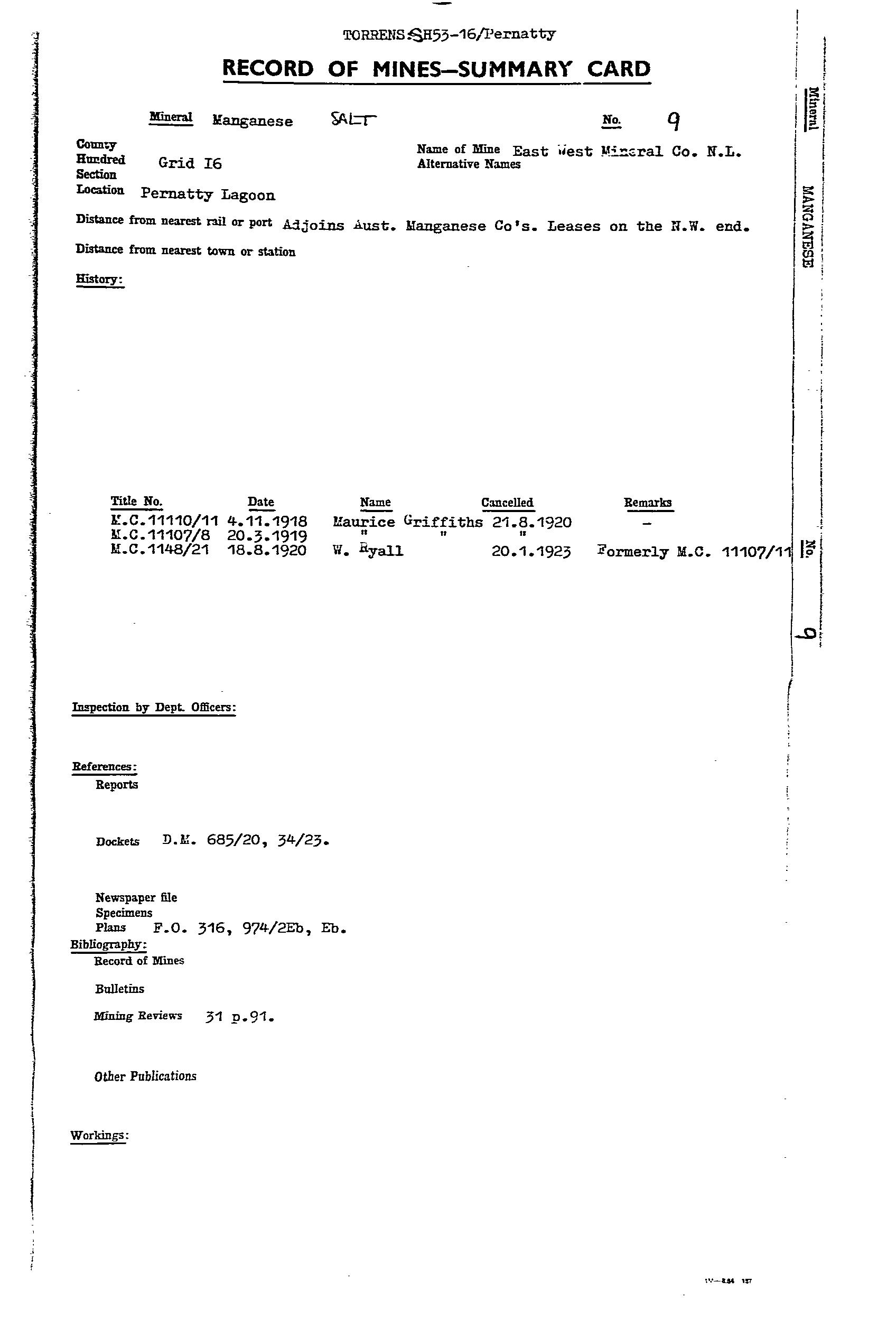 AUSTRALIAN MANGANESE; BIG; BLUE; EAST WEST MINERAL CO. NL; F.R.J. MANGANESE CLAIM; HORSE SHOE; LAKE; MAGAZINE 1; MAGAZINE 2; MAIN; MCGREGORS LAKE; ML 2774; ML 2776; ML 5787; SOUTH EXTENDED MANGANESE SYNDICATE; TRIBUTORS; WASHER