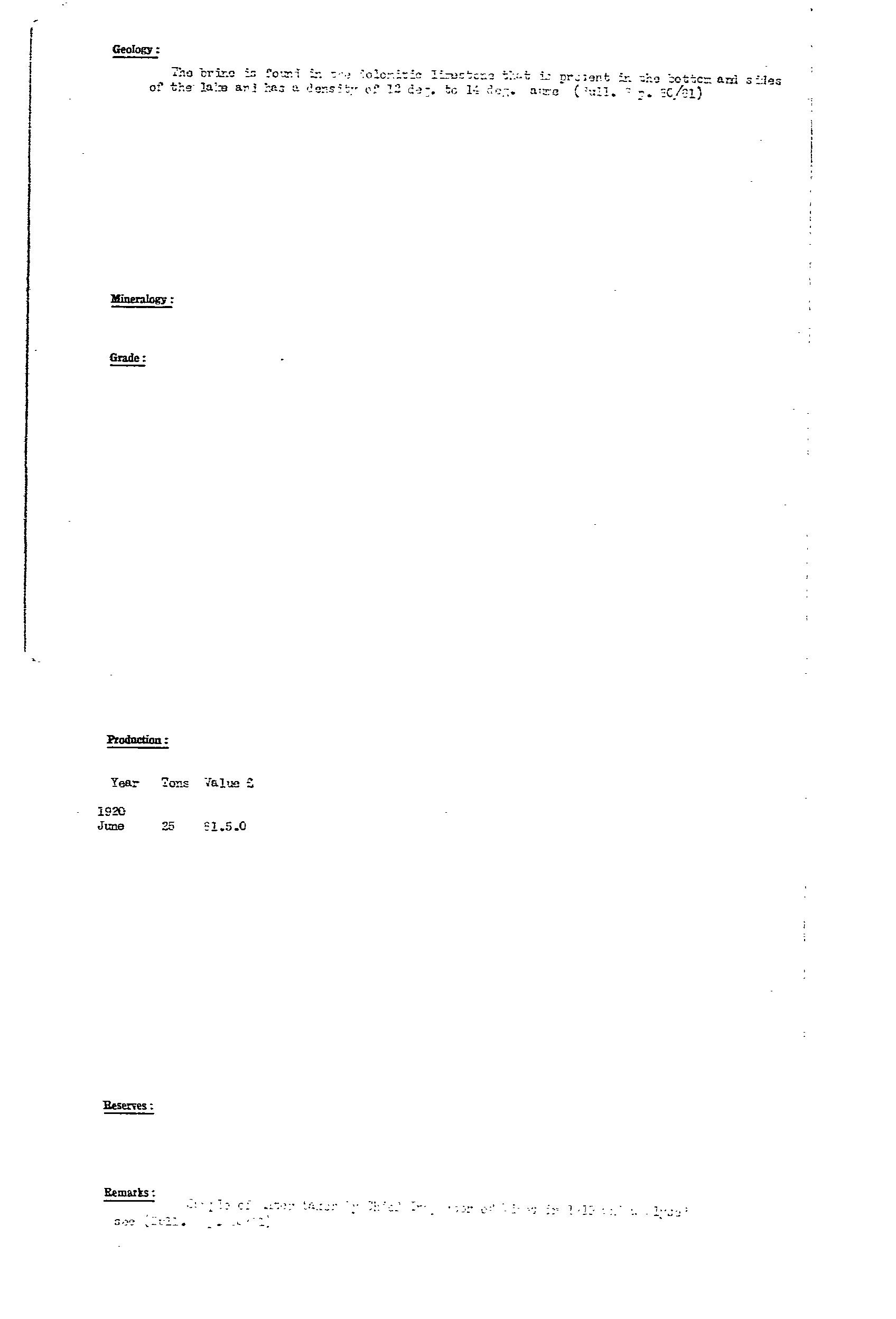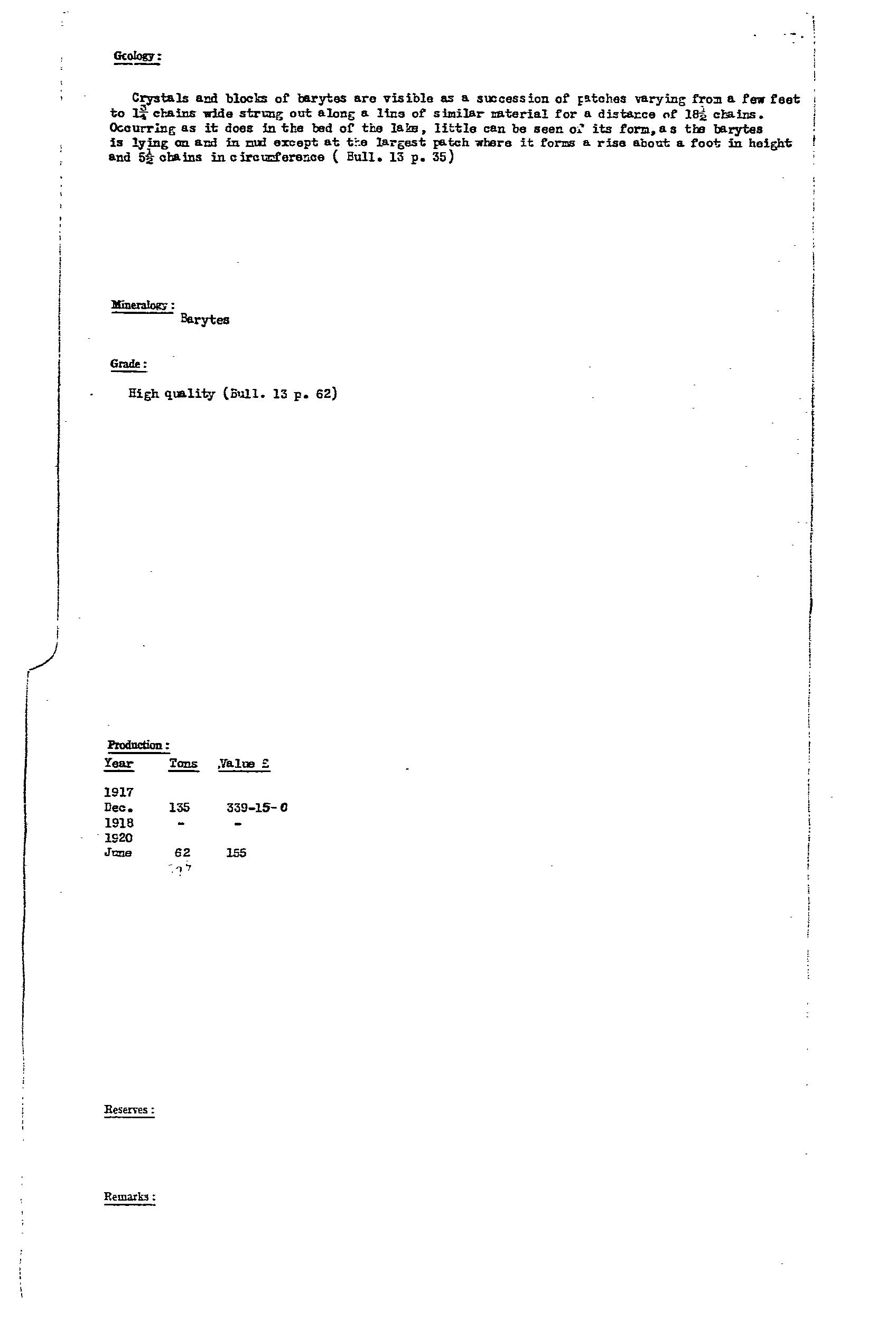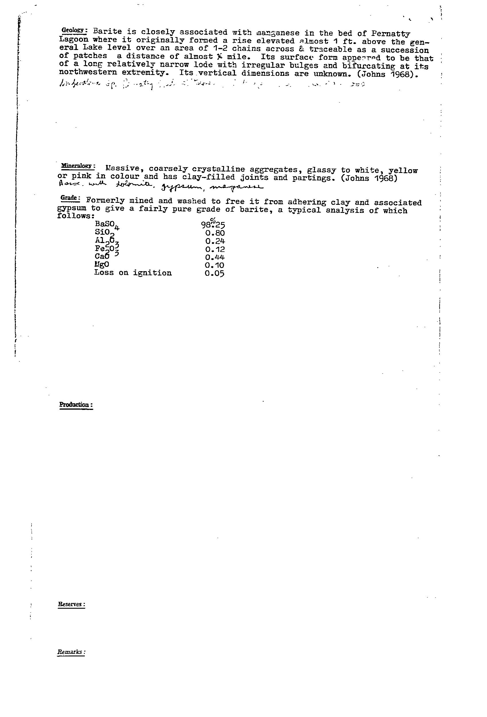 Barite was produced from a narrow 20m wide lode in host Woocalla Dolomite and exposed for ~350m along strike (Fig 8, Bull 41 for location of workings). The lode had irregular bulges, and bifurcated at its northern end. The barite was coarsely crystalline, glassy, white, yellow, pink, with clay-filled joints. The ore was washed to remove clay to provide a product of 98% BaSO4 and up to 2.6% SrSO4. Production included 748 tonne from 1917-24, and 657 tonne from 1938-39. Resource estimate in 1971 was ~160,000 tonne to 10m depth. Prospects for finding more barite were considered to be favourable, with mention of a small outcrop 6km to the south.