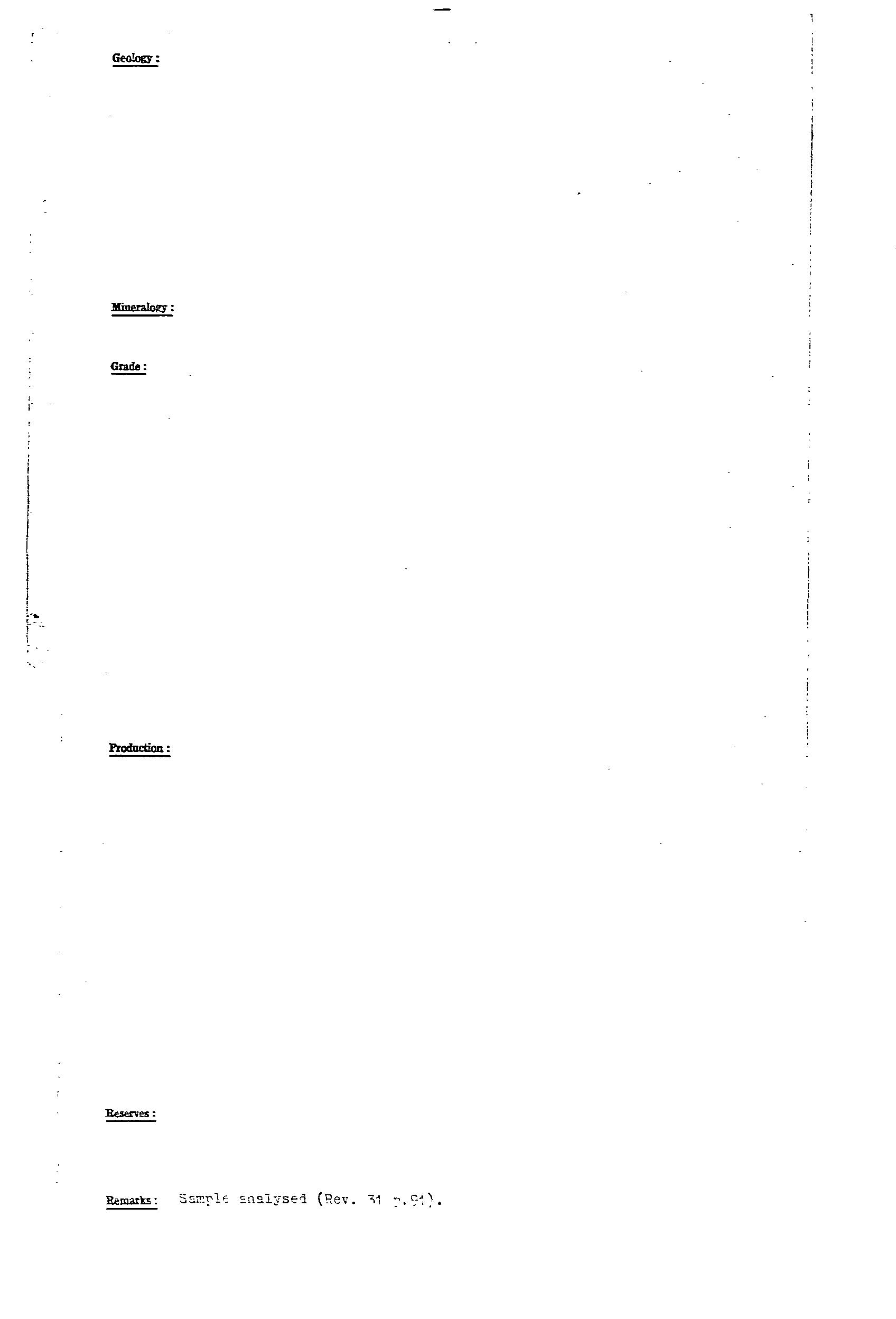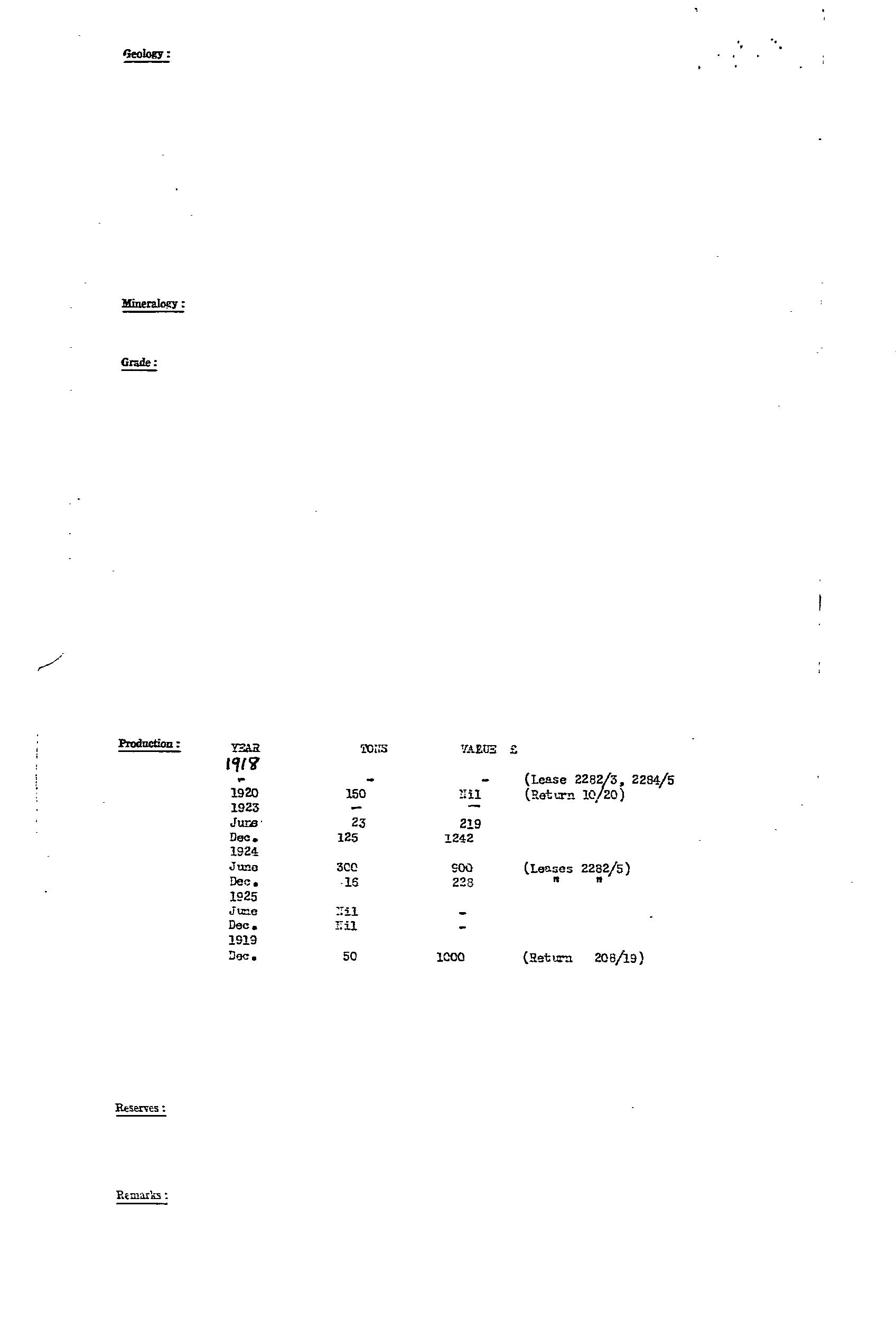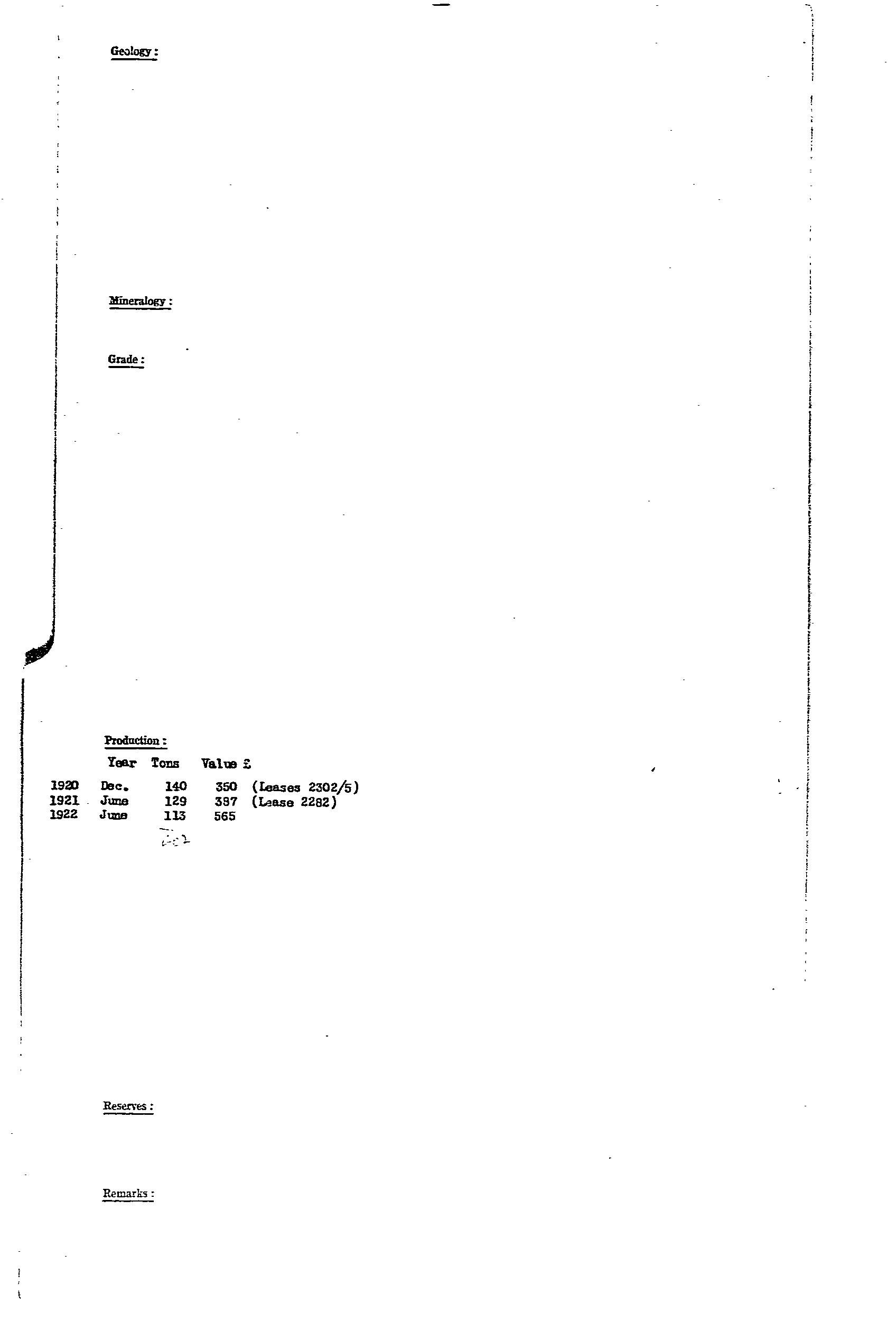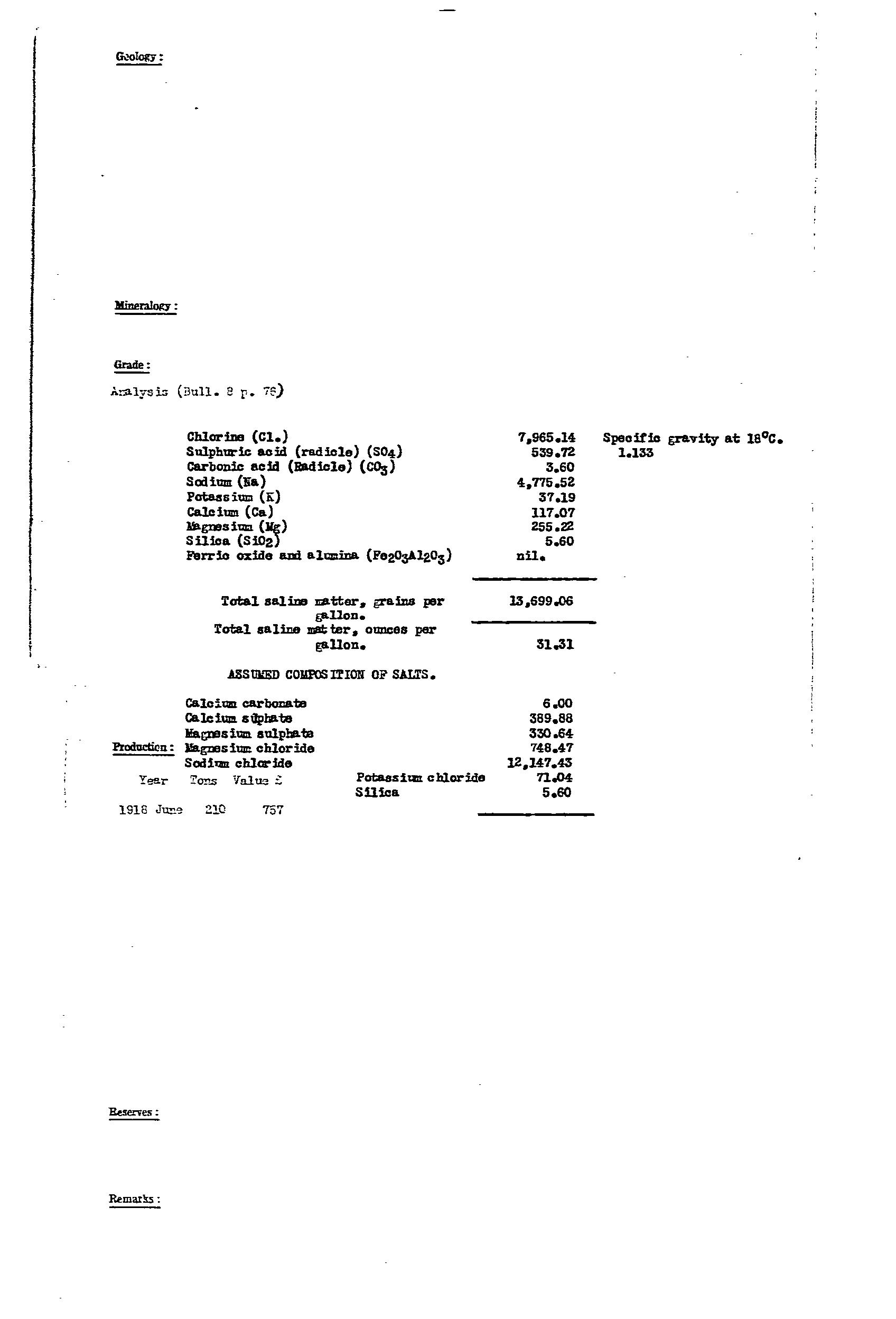 Barite was produced from a narrow 20m wide lode in host Woocalla Dolomite and exposed for ~350m along strike (Fig 8, Bull 41 for location of workings). The lode had irregular bulges, and bifurcated at its northern end. The barite was coarsely crystalline, glassy, white, yellow, pink, with clay-filled joints. The ore was washed to remove clay to provide a product of 98% BaSO4 and up to 2.6% SrSO4. Production included 748 tonne from 1917-24, and 657 tonne from 1938-39. Resource estimate in 1971 was ~160,000 tonne to 10m depth. Prospects for finding more barite were considered to be favourable, with mention of a small outcrop 6km to the south.