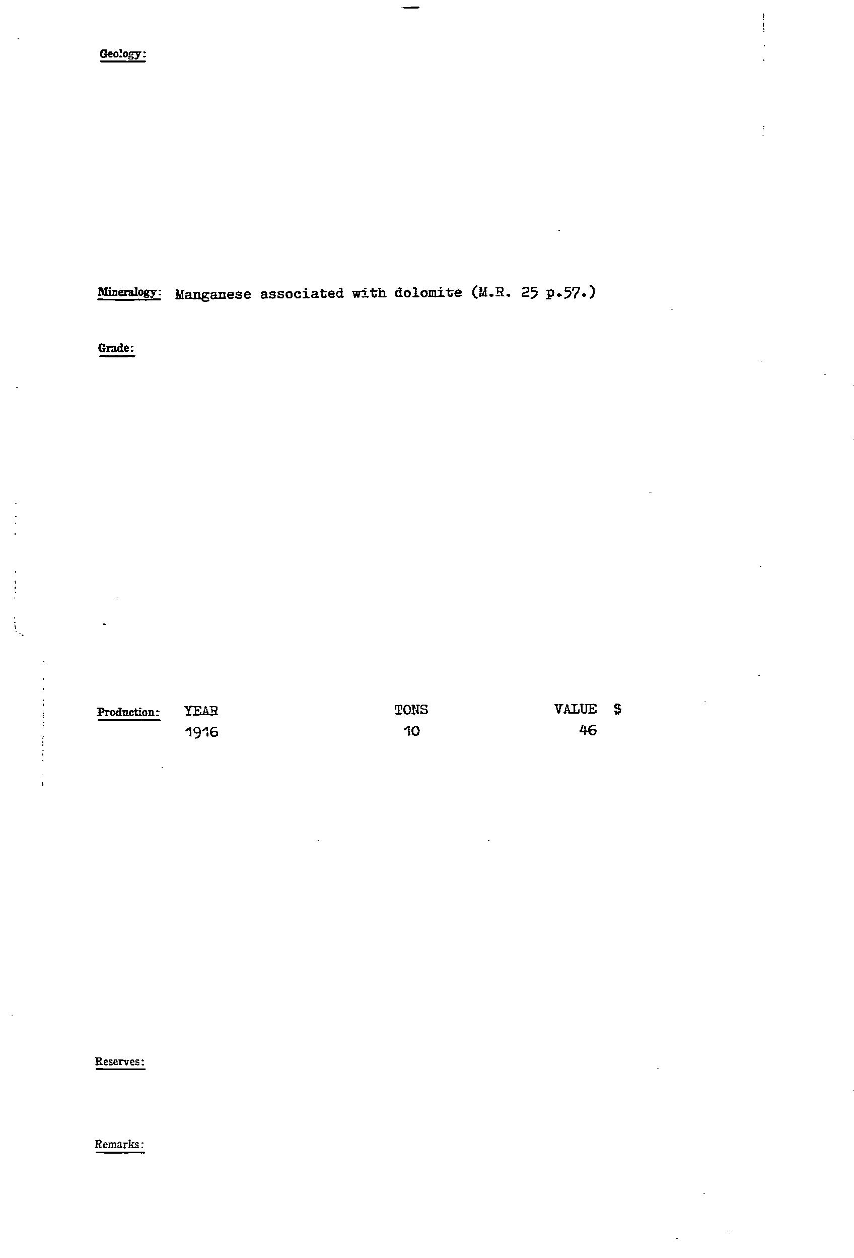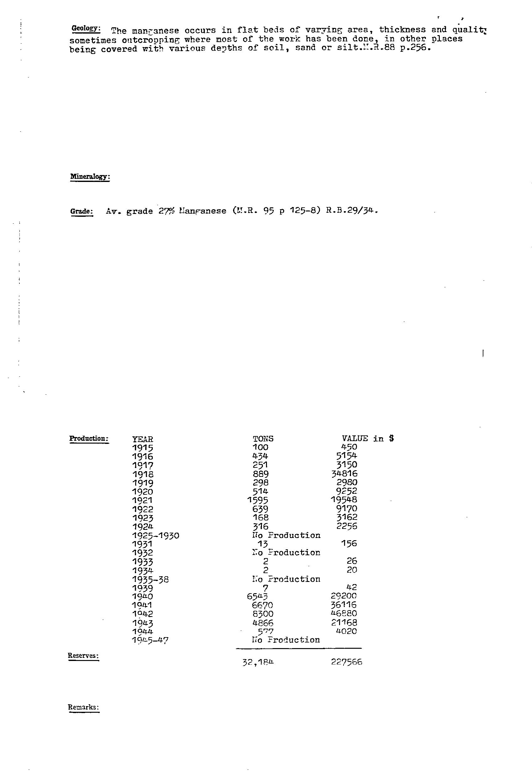 manganese oxide developed as irregular masses & nodules in residual clay, & formed in rudely developed joint system in host Woocalla Dolomite. Production 1915-49 ~34,500t @ 47.5%Mn, 1986 resource estimate 167,500t @ ~20%Mn.