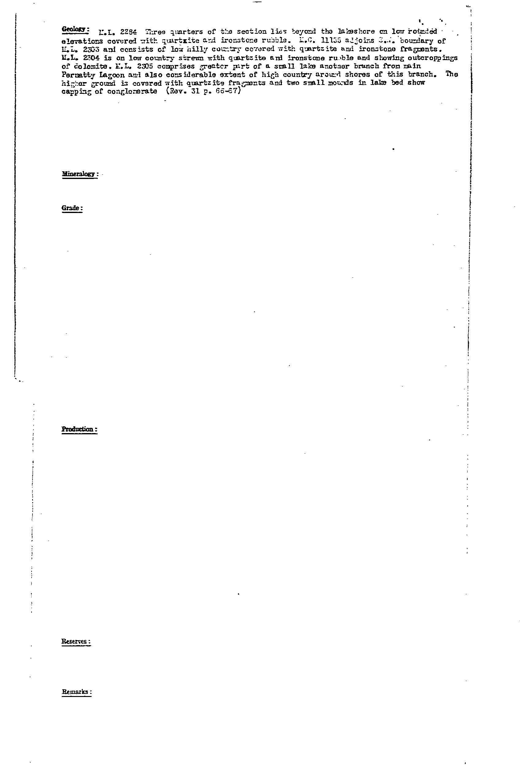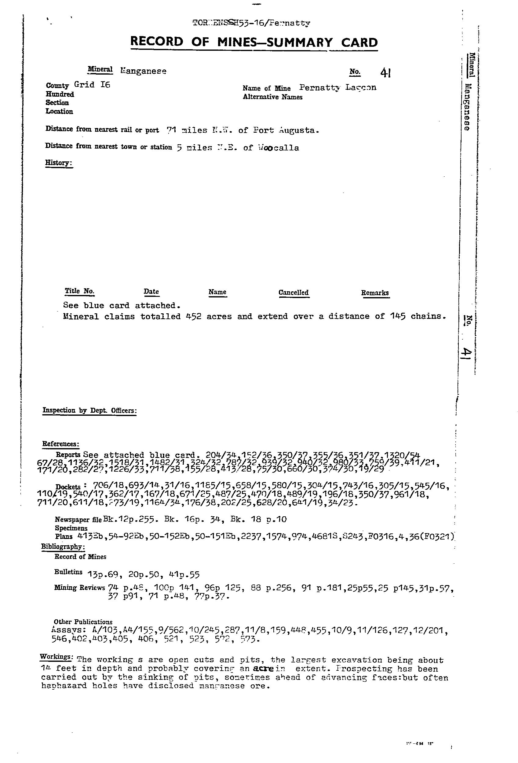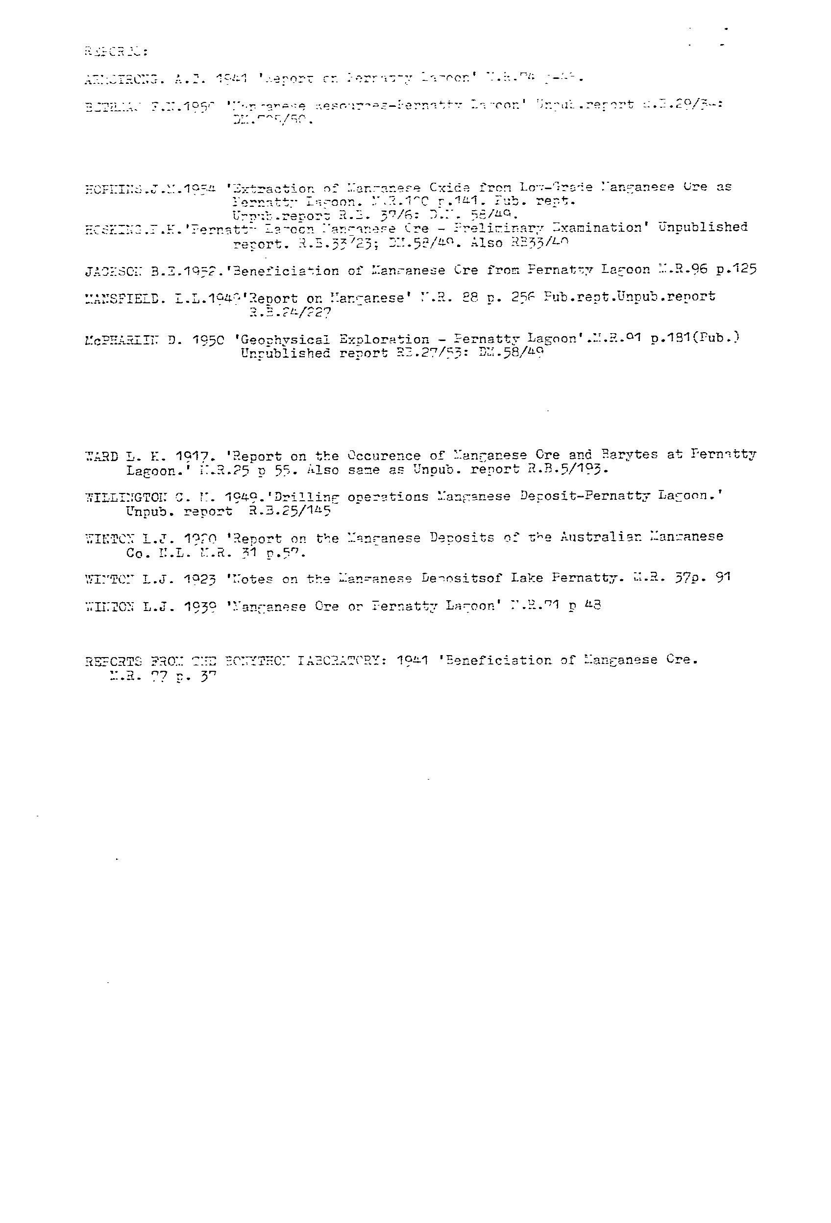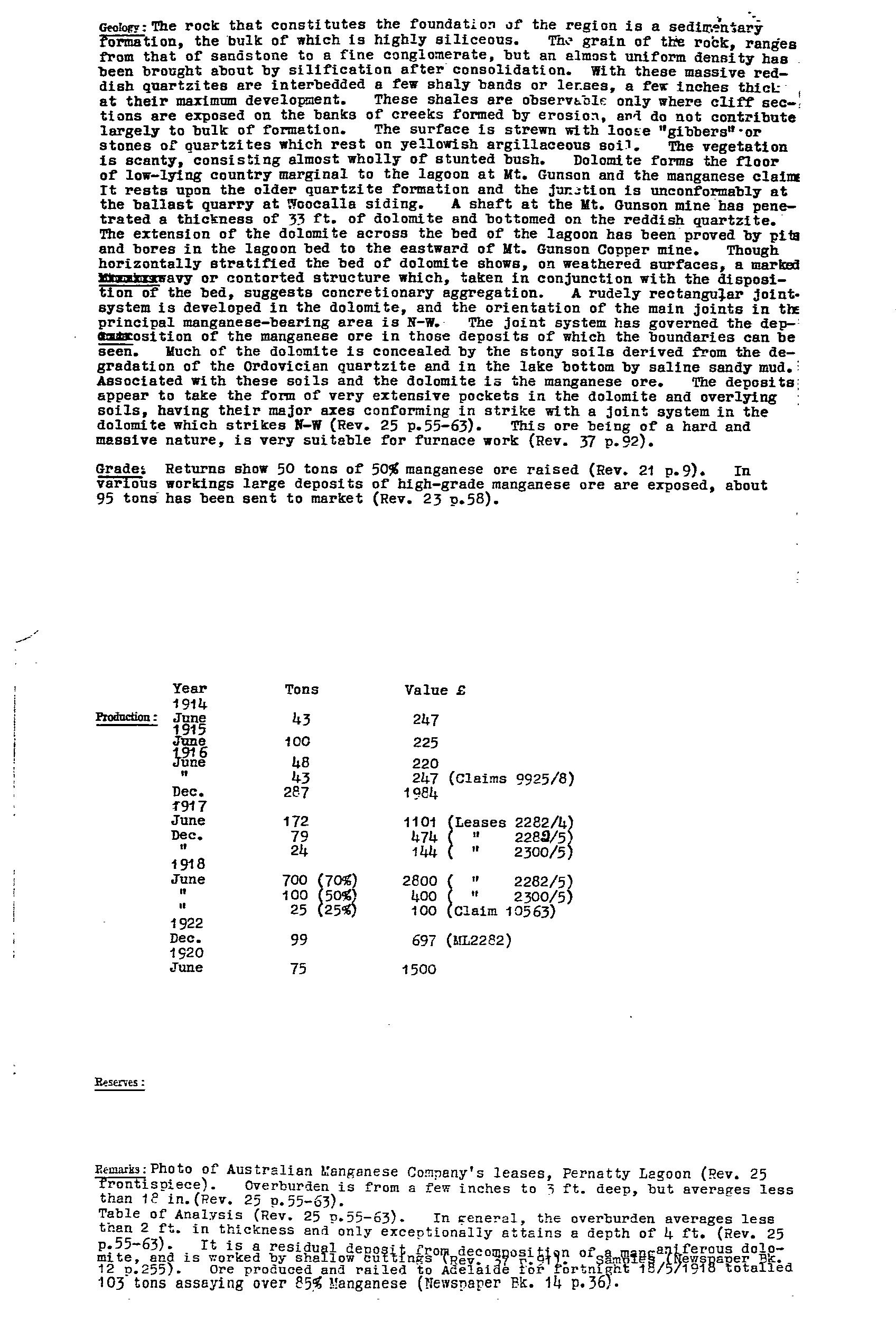 PERNATTY LAGOON, main manganese workings located on an embayment on the western side of Pernatty Lagoon. The workings were on the lagoon floor, and on the adjacent shore, extending for ~1.7 km. Manganese oxides occurred as irregular masses and nodules of varying size in residual clay, and formed by the decomposition of the manganiferous Woocalla Dolomite. The orebodies tended to parallel a rudely developed rectangular joint system in the host dolomite, with the main orientation being NW. There was a thin cover of lake silt/sand, which made exploration difficult. The main workings included Big Quarry, which was 14 ft deep, covering almost an acre. At Big Quarry the ore was reported as occurring in layers differing in quality, thickness and appearance. The limit of the ore was only reached at the southern end. Most of the workings finished in either ironstone or dolomite. The ore minerals were psilomelane and pyrolusite, and ranged from hard, black, to soft, blue, earthy wad. The harder, higher grade ore was easily upgraded by hand picking. The ore was irregularly distributed over an appreciable area, with estimates suggesting removal of 2 tonne of ferruginous ore and overburden for every1 tonne of manganese ore recovered. Winton (MR31, pp 90) reported a pit sunk to 2 m on natural red ochre (Indian red), and outcropping at the edge of the lagoon within MS 1135. Production from 1915-49 estimated at 34,500 tonne @ 47.55Mn. Remaining resources estimated in 1986 at 167,500 tonne @ 19.6%Mn for cutoff of 10%Mn.
