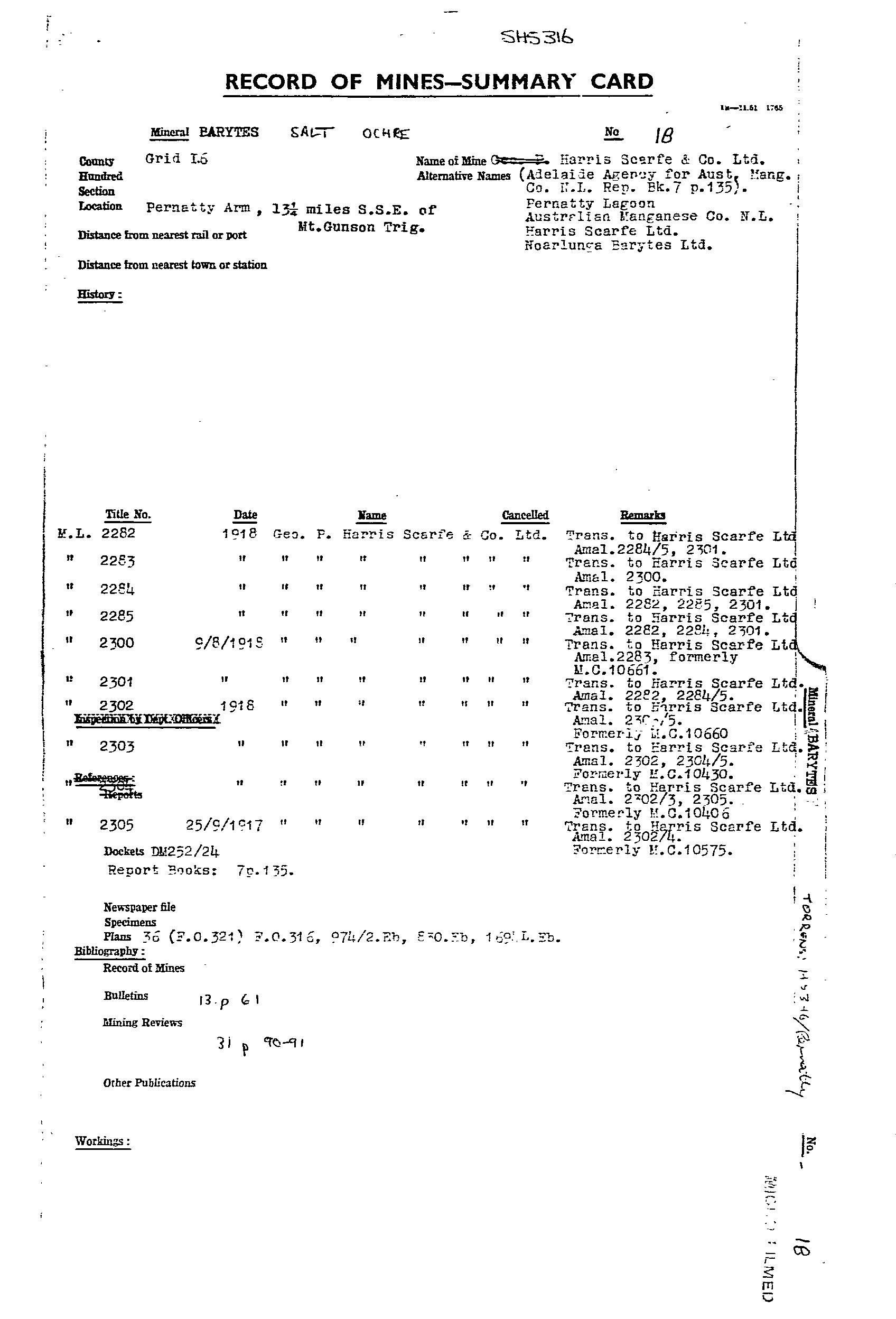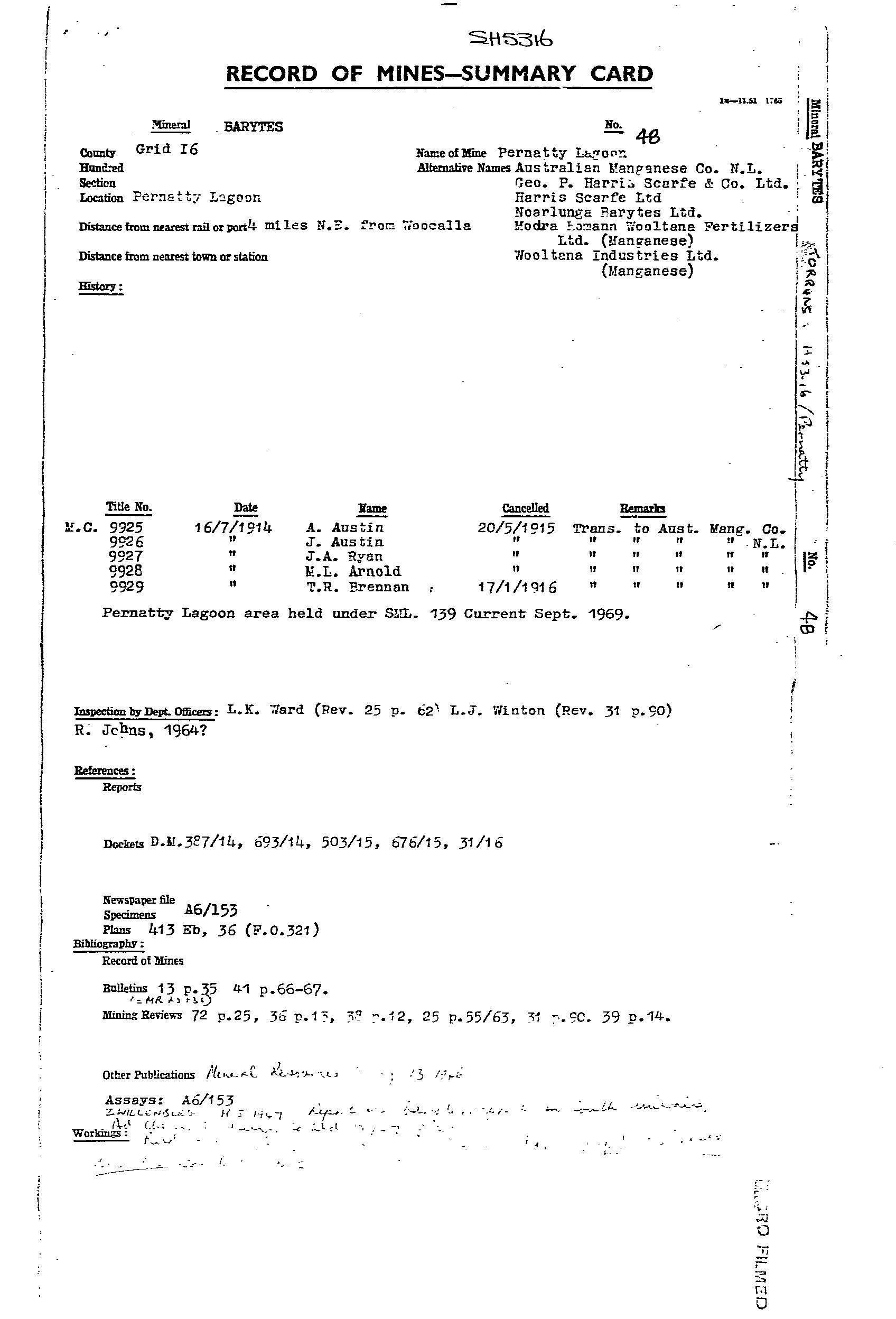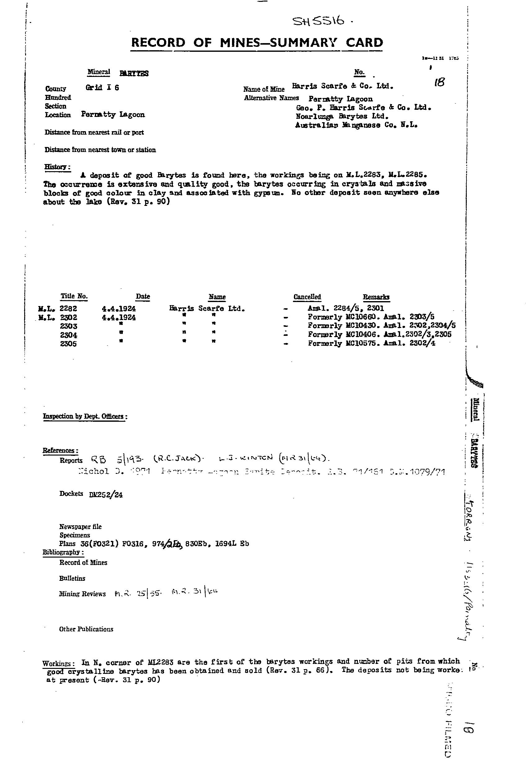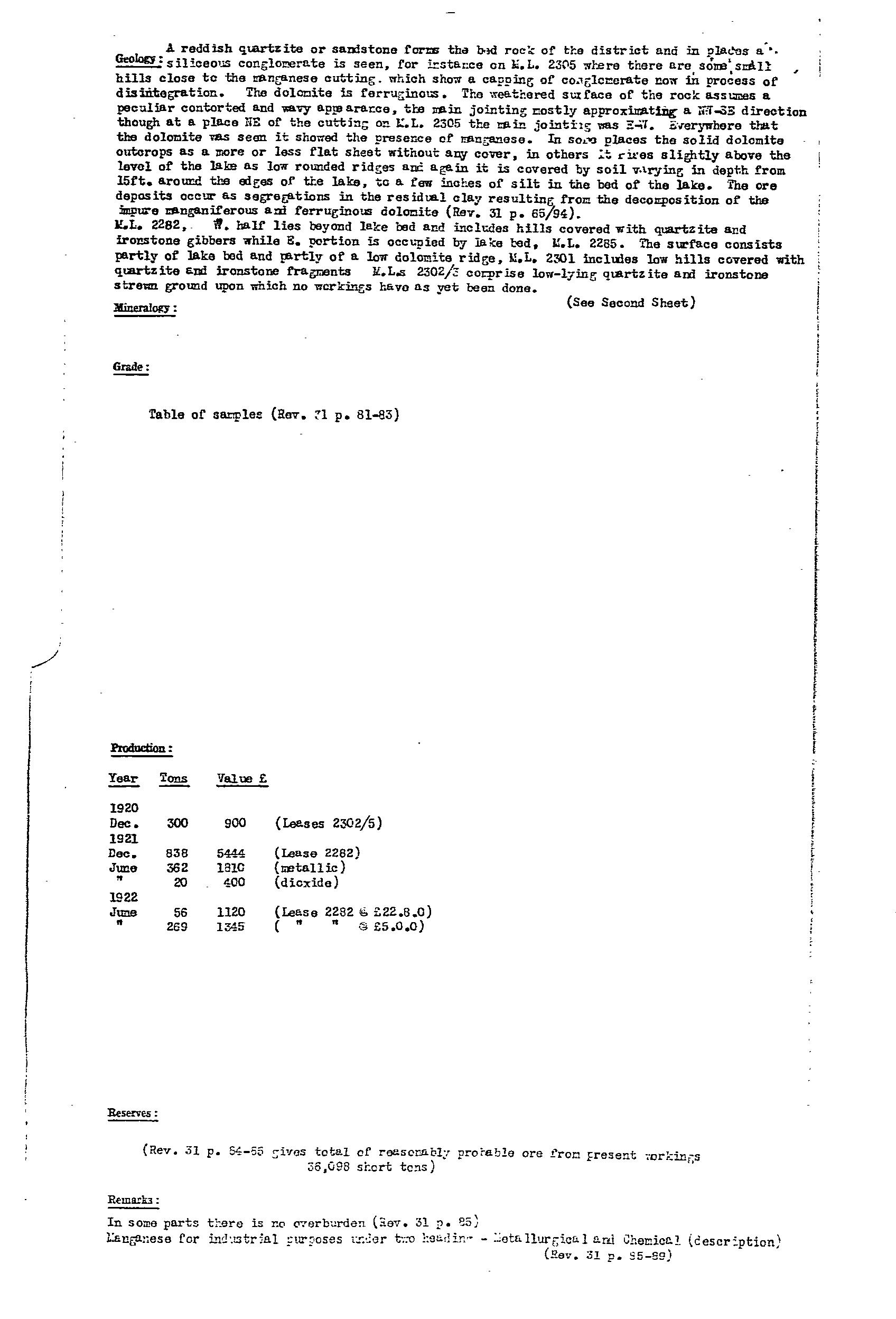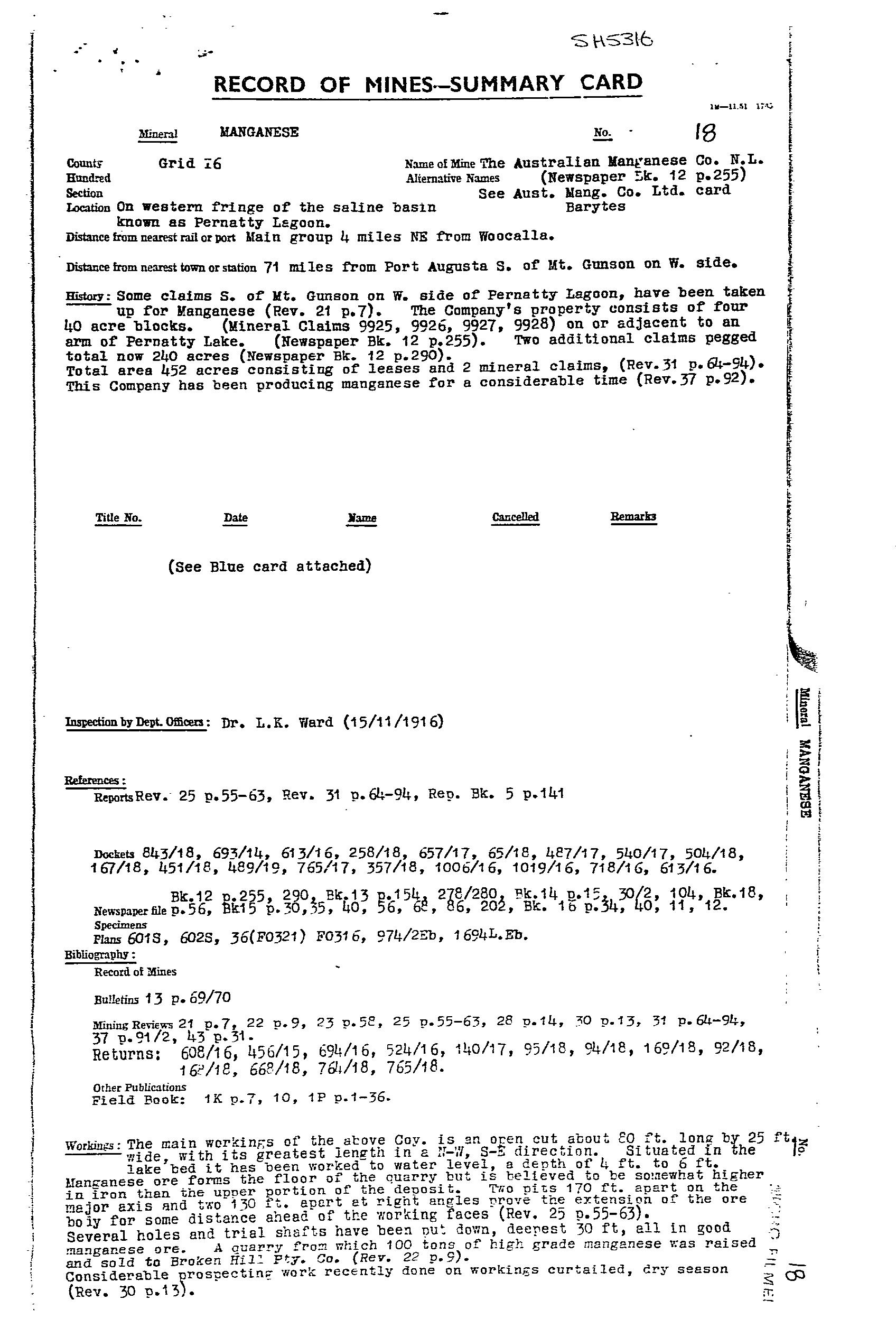 PERNATTY LAGOON, main manganese workings located on an embayment on the western side of Pernatty Lagoon. The workings were on the lagoon floor, and on the adjacent shore, extending for ~1.7 km. Manganese oxides occurred as irregular masses and nodules of varying size in residual clay, and formed by the decomposition of the manganiferous Woocalla Dolomite. The orebodies tended to parallel a rudely developed rectangular joint system in the host dolomite, with the main orientation being NW. There was a thin cover of lake silt/sand, which made exploration difficult. The main workings included Big Quarry, which was 14 ft deep, covering almost an acre. At Big Quarry the ore was reported as occurring in layers differing in quality, thickness and appearance. The limit of the ore was only reached at the southern end. Most of the workings finished in either ironstone or dolomite. The ore minerals were psilomelane and pyrolusite, and ranged from hard, black, to soft, blue, earthy wad. The harder, higher grade ore was easily upgraded by hand picking. The ore was irregularly distributed over an appreciable area, with estimates suggesting removal of 2 tonne of ferruginous ore and overburden for every1 tonne of manganese ore recovered. Winton (MR31, pp 90) reported a pit sunk to 2 m on natural red ochre (Indian red), and outcropping at the edge of the lagoon within MS 1135. Production from 1915-49 estimated at 34,500 tonne @ 47.55Mn. Remaining resources estimated in 1986 at 167,500 tonne @ 19.6%Mn for cutoff of 10%Mn.