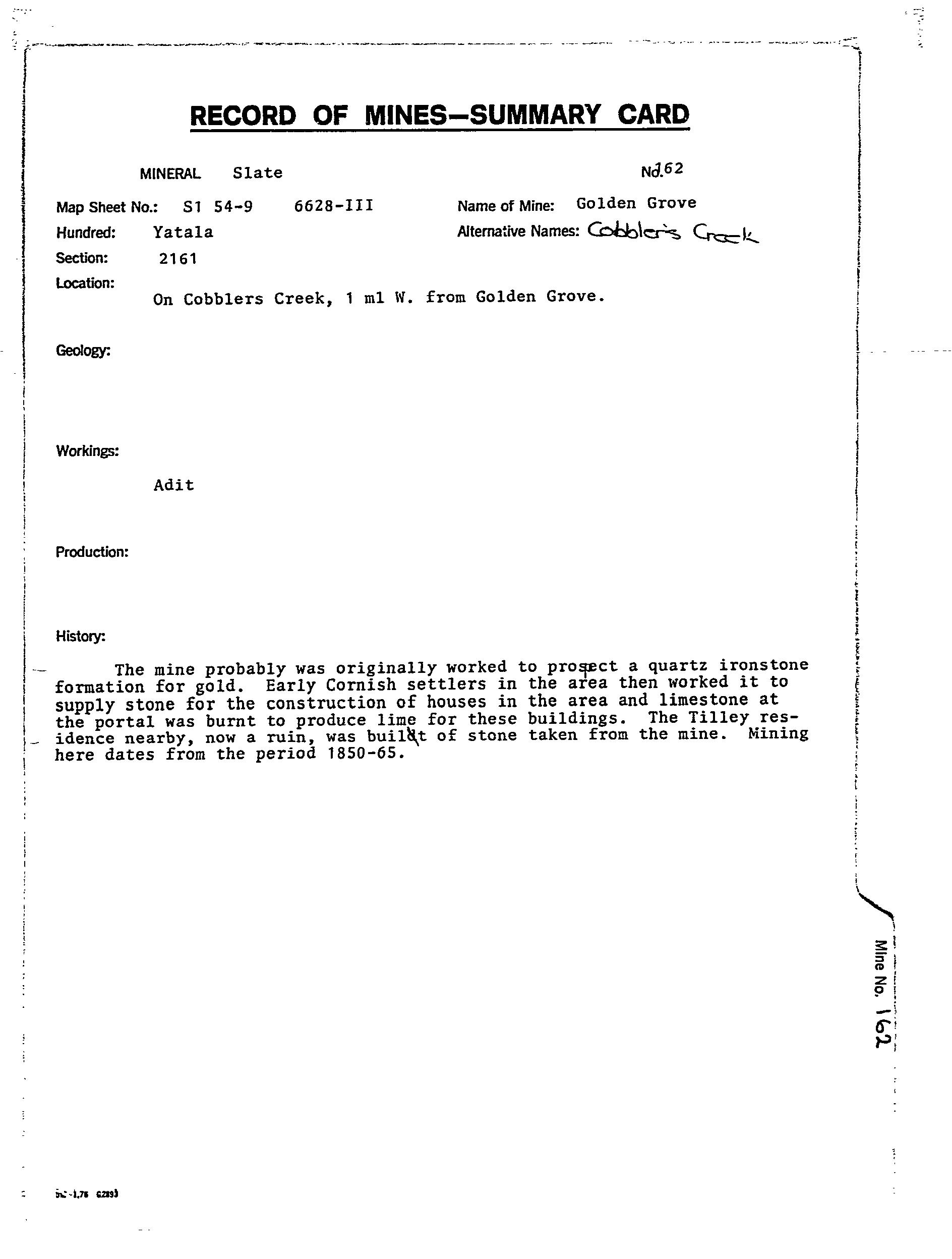COBBLER CREEK NO.1, adit was excavated from 1850-65, originally on a quartz-iron oxide lode for gold. Slate of the Saddleworth Formation was mined for building stone used locally, with limestone at the portal mined, and burnt to produce lime for mortar. Area is open ground marginal to a small creek and within the Adelaide metropolitan built up zone (2008).