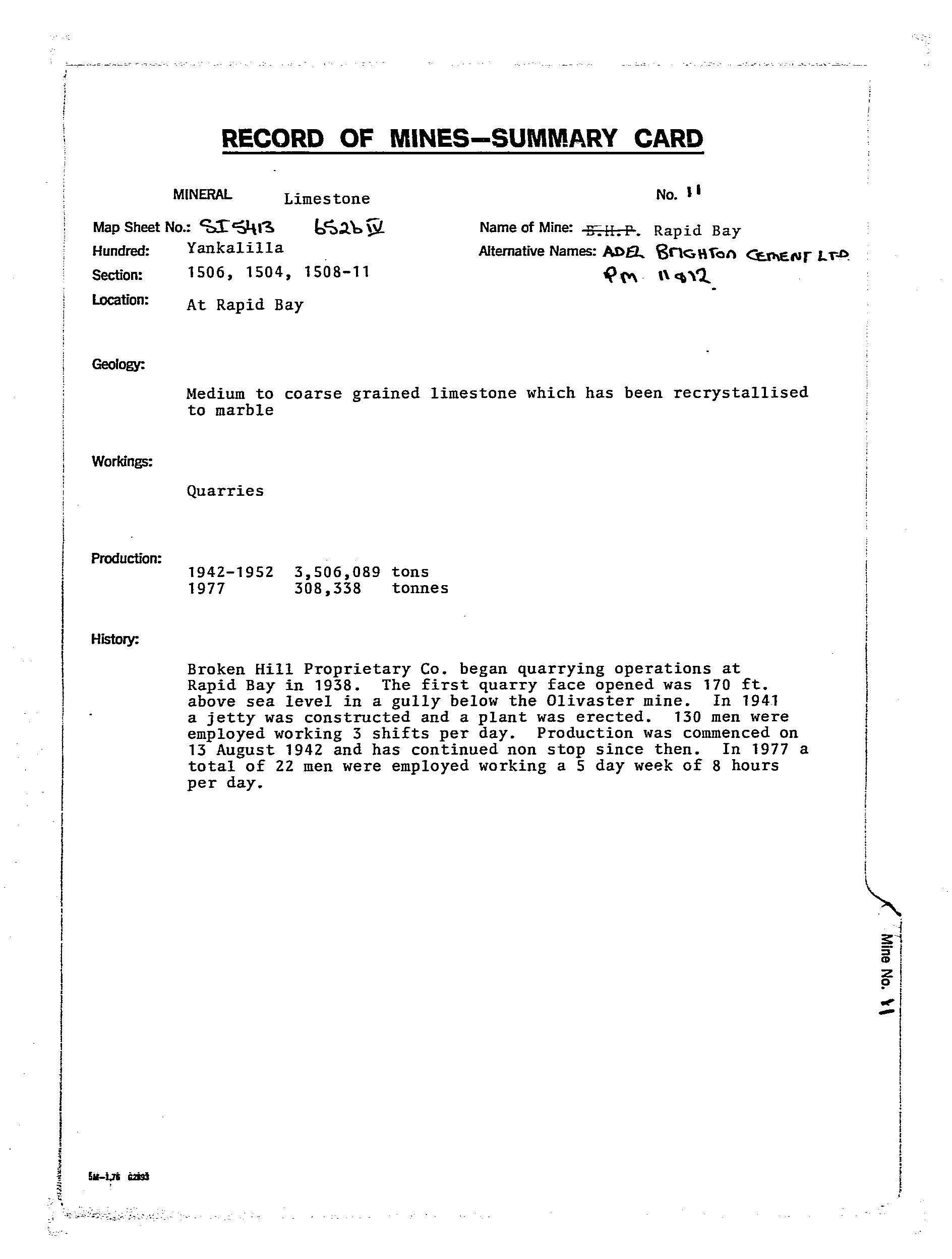RAPID BAY, limestone was quarried from 1942-81 to supply metallurgical flux to the Whyalla, Newcastle and Port Kembla steelworks. The deposit consisted of grey, white and brown medium to coarse-grained banded marble of the Normanville Group, which occurred as a 200-300 m thick lens within a NE-trending overturned syncline.