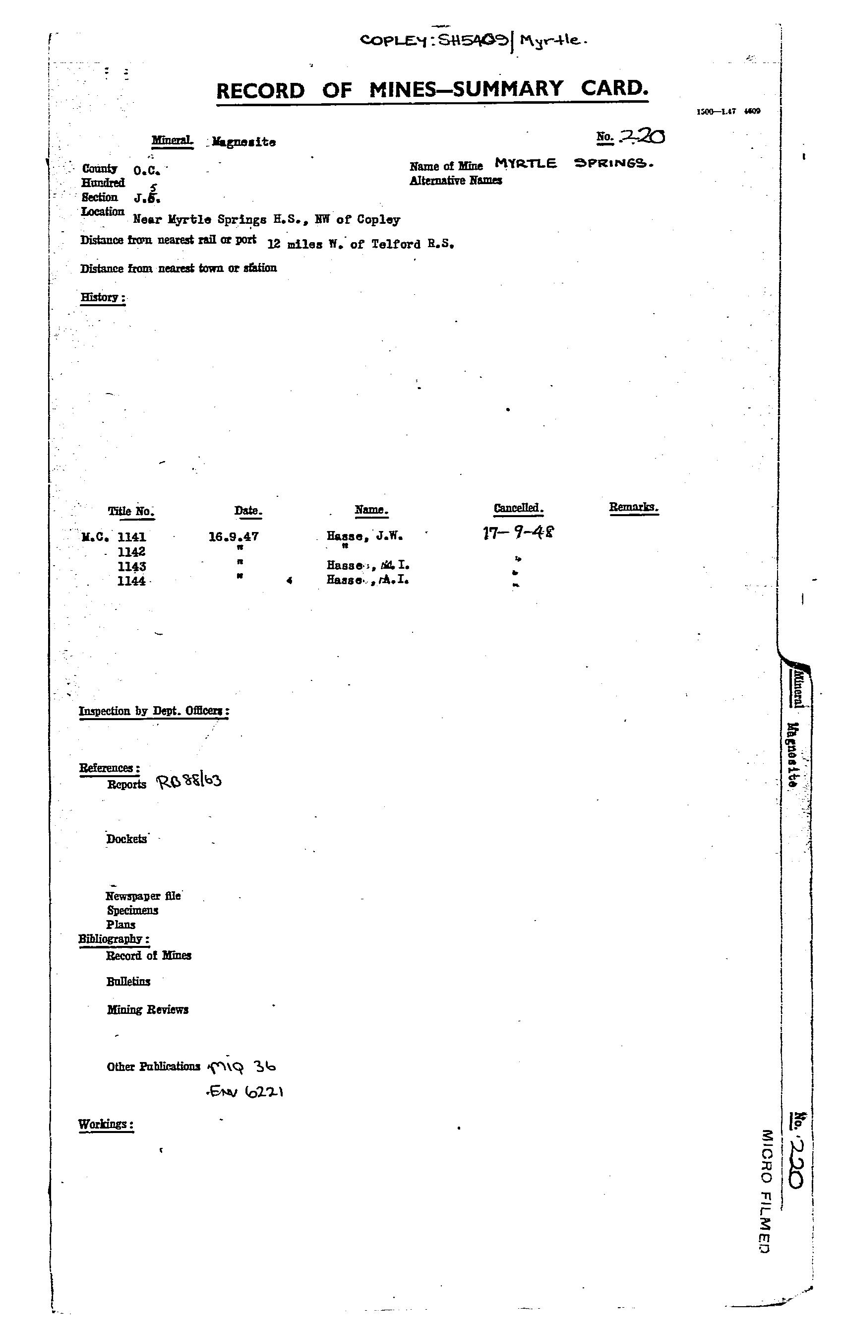 MYRTLE SPRINGS, claims were taken out over beds of magnesite in the Myrtle Springs area in 1945, with tenure continuous until the 1990's. The beds were worked in a series of pits and quarries extending along the strike of the magnesite beds. The main bed was to 2 m thick, with mining proceeding by removal of overburden from the hanging wall, followed by mining in a long narrow slot to 8 m below plain level. The largest quarry was 100 m long x 3 m wide by 5 m deep, with a second quarry on ML's 4151-52 having dimensions 155 m long by 7 m wide by up to 8 m deep. First production was 105 tonnes in 1947, followed by 3,829 tonne from 1955-64, and 2,843 tonnes from 1970-83. In 1984-85 Commercial Minerals Ltd (now Unimin Australia Limited) carried out large-scale operations on the current mine site. A total of 12,848 tonnes (1984), and 17,876 tonnes (1985) were supplied to the aluminium industry in Queensland. After high rates in these two years, production dramatically decreased, and averaged less than 1000 tonnes/year thereafter. Mining was then carried out on a campaign basis as required. Total production from 1947-2013 was estimated at 61,000t.
