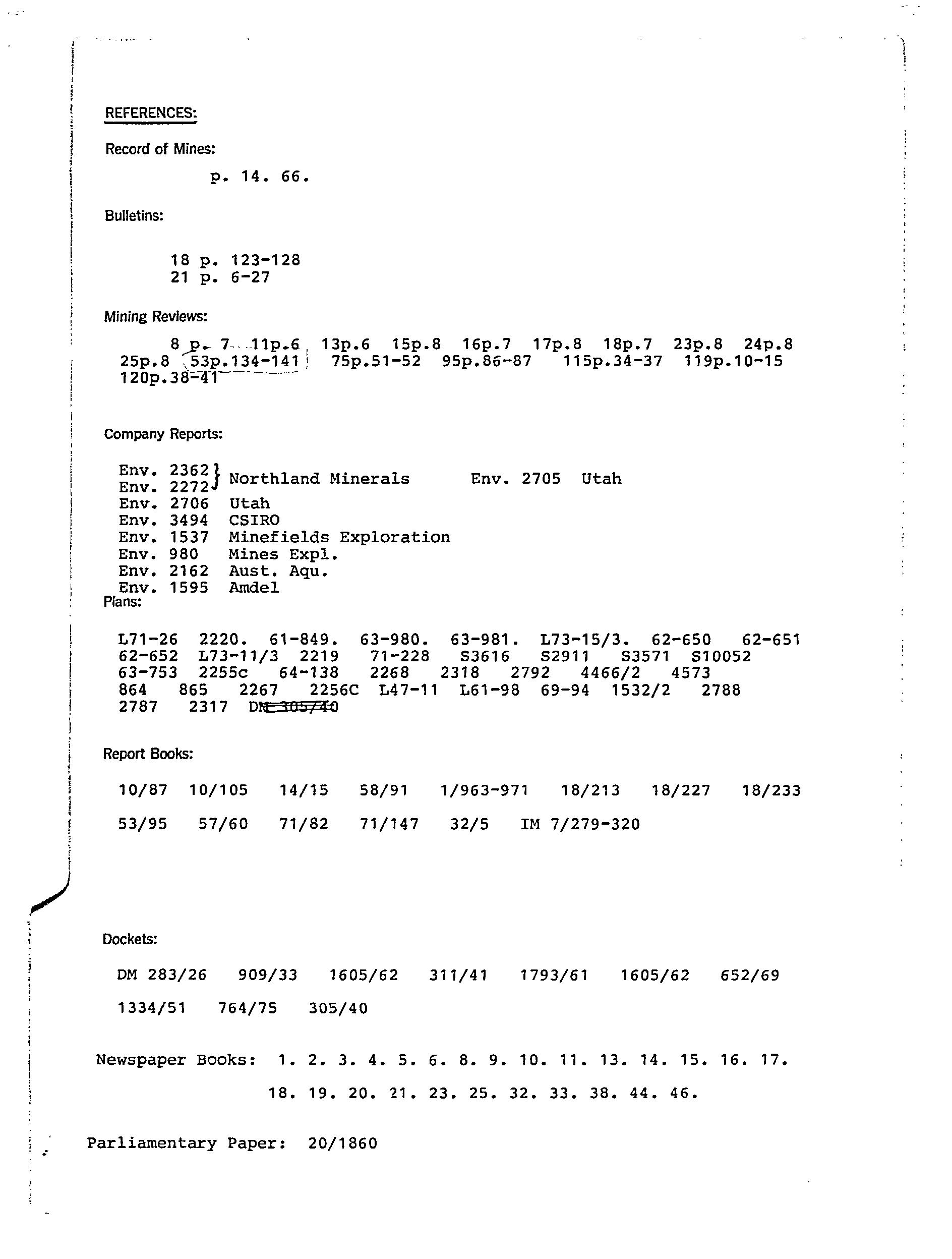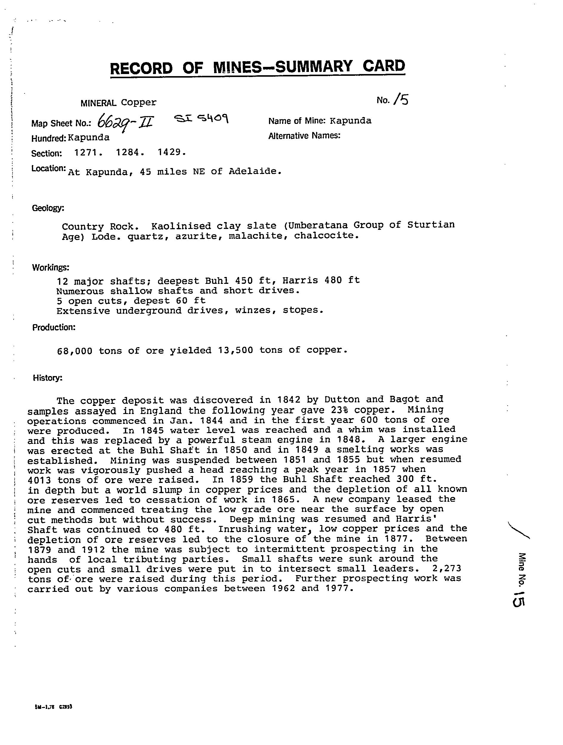 KAPUNDA, discovered in 1842, with initial mining as open cuts, then underground. The underground workings extended for >1km strike length along a NNW-trending zone from Dutton Mine in the north to Hillside Mine in the south, after which mineralisation was covered by recent alluvials. Regional structural setting was W flank of a broad domal fold, with axis trend 160-170, and mineralisation closely associated with a NW-NNW-trending structure termed the Mine Fault.