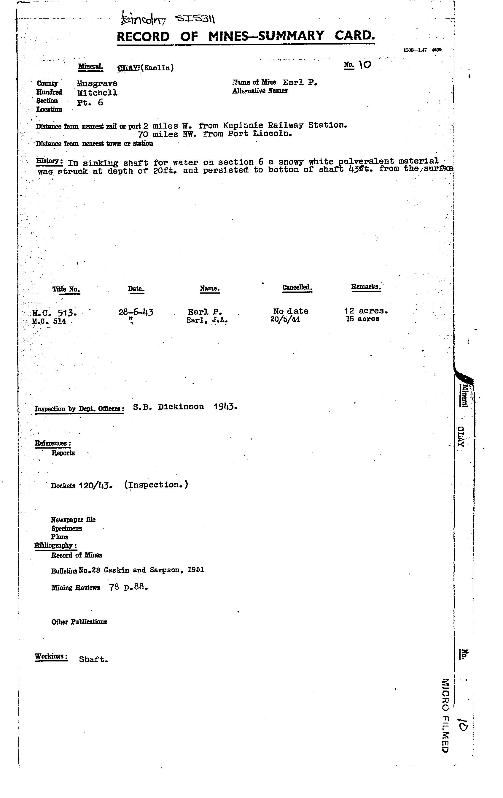 shaft sunk for water in early 1940's penetrated kaolin from 6-13 m. There was cover of ~1 m of calcrete (see pp 88, MR 78).