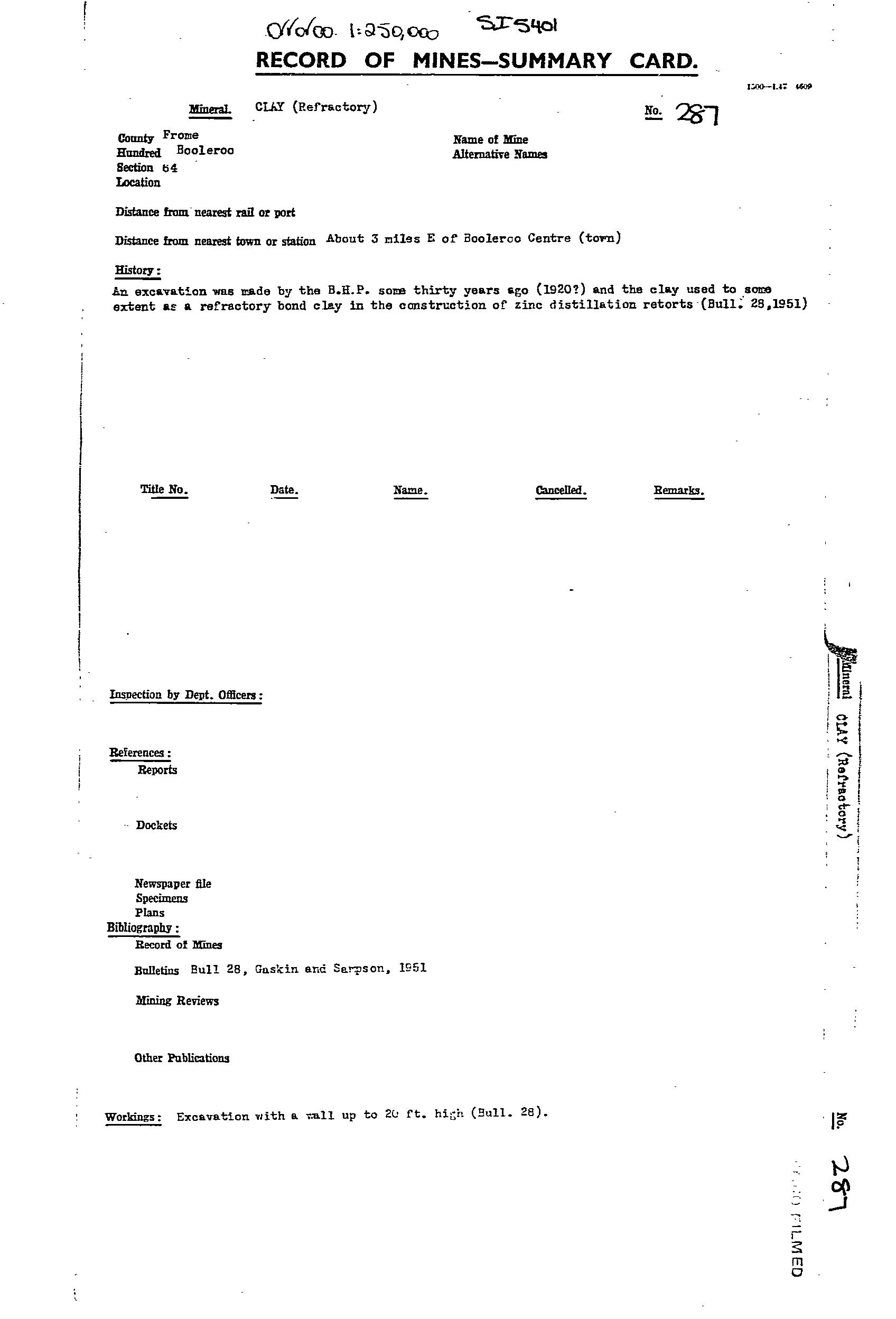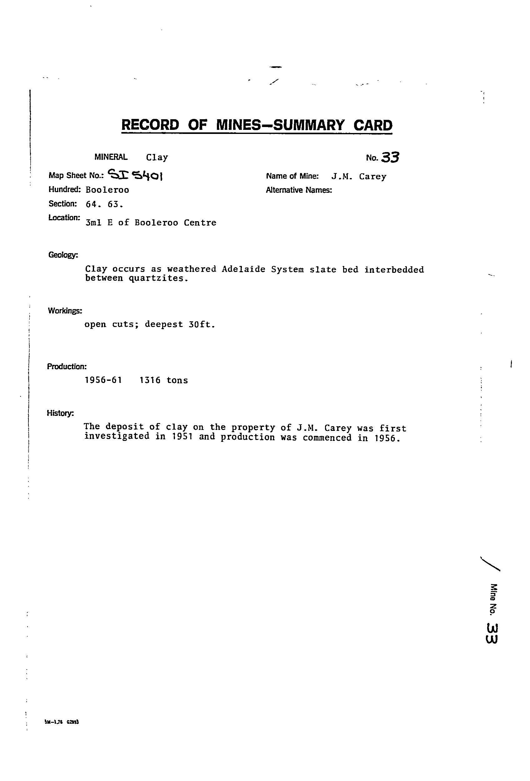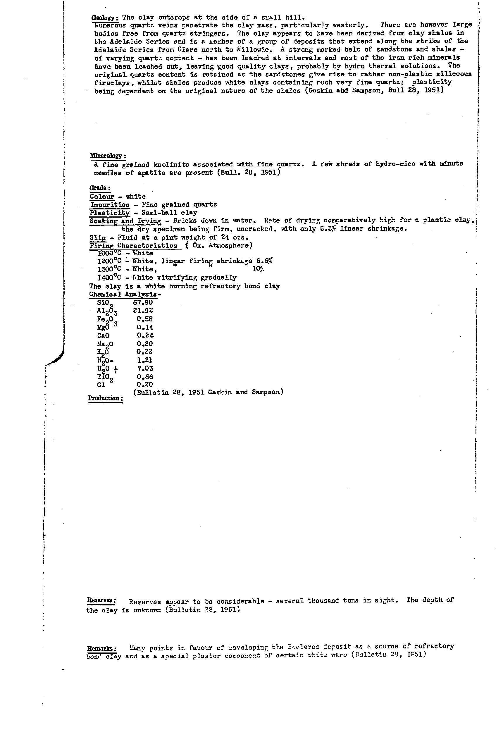Opened by BHP in the 1920s for white clay for refractory use at the Port Pirie smelters. Re-opened in 1951, with production of fire clay from 1956-61 of 1,337 tonne and then from 1991-2013 >200 tonne. Resource drilling by the Geological Survey in 1951 in 6 holes, 5 of which tested the resource at the site of the quarry, and 1 hole drilled ~950m to the NNE. The drilling identified ~6m of overburden of silcreted Tertiary sandstone over white kaolinitic clay to 5m thickness. Resources of grit-free clay were estimated at 37,600 tonne for removal of 7100 tonne overburden. No account was taken of resources of gritty clay. The hole drilled to the NNE penetrated a considerable thickness of somewhat gritty white clay. Observations of the surrounds reveals north of the road widespread bleached bedrock compared to south of the road. In the northern areas silcrete is found in abundance. It was concluded that the hard, resistant caprock has protected the soft bleached rock from erosion. In places where the silcrete has been eroded the clayey material underneath has also. A program of drilling to prove up 1Mt was recommended but not implemented. Prospects appear good for finding considerable additional resources. Bulk mining would probably require a washing plant to remove the gritty material.