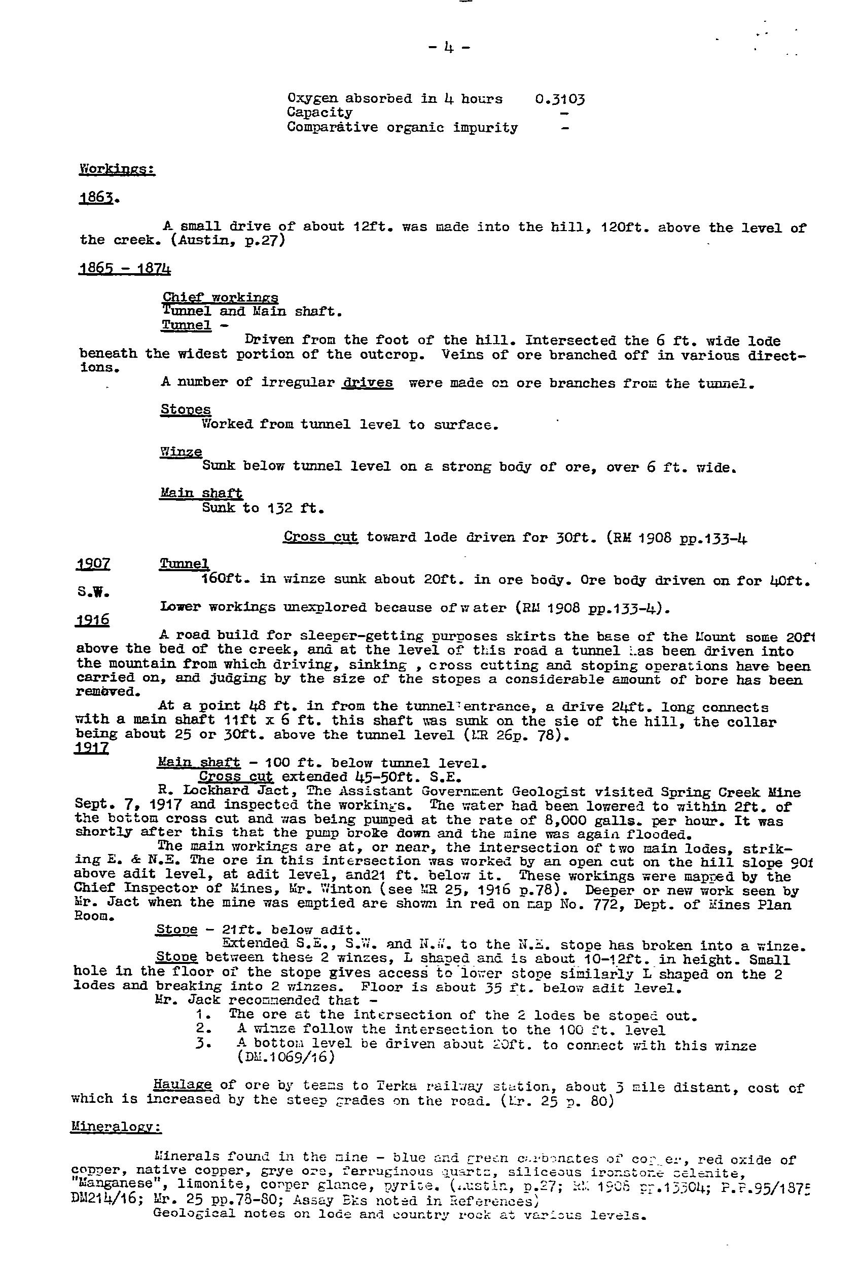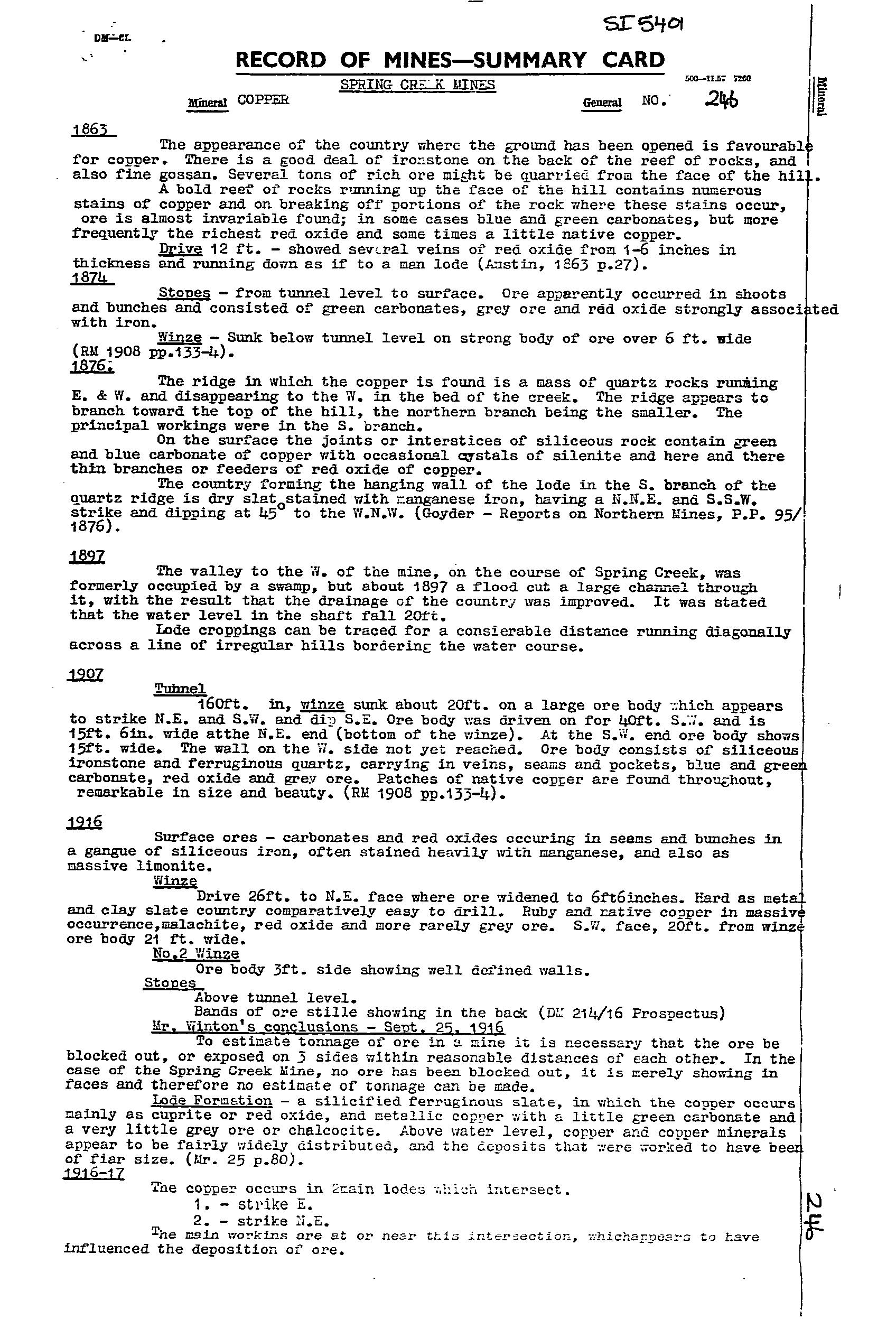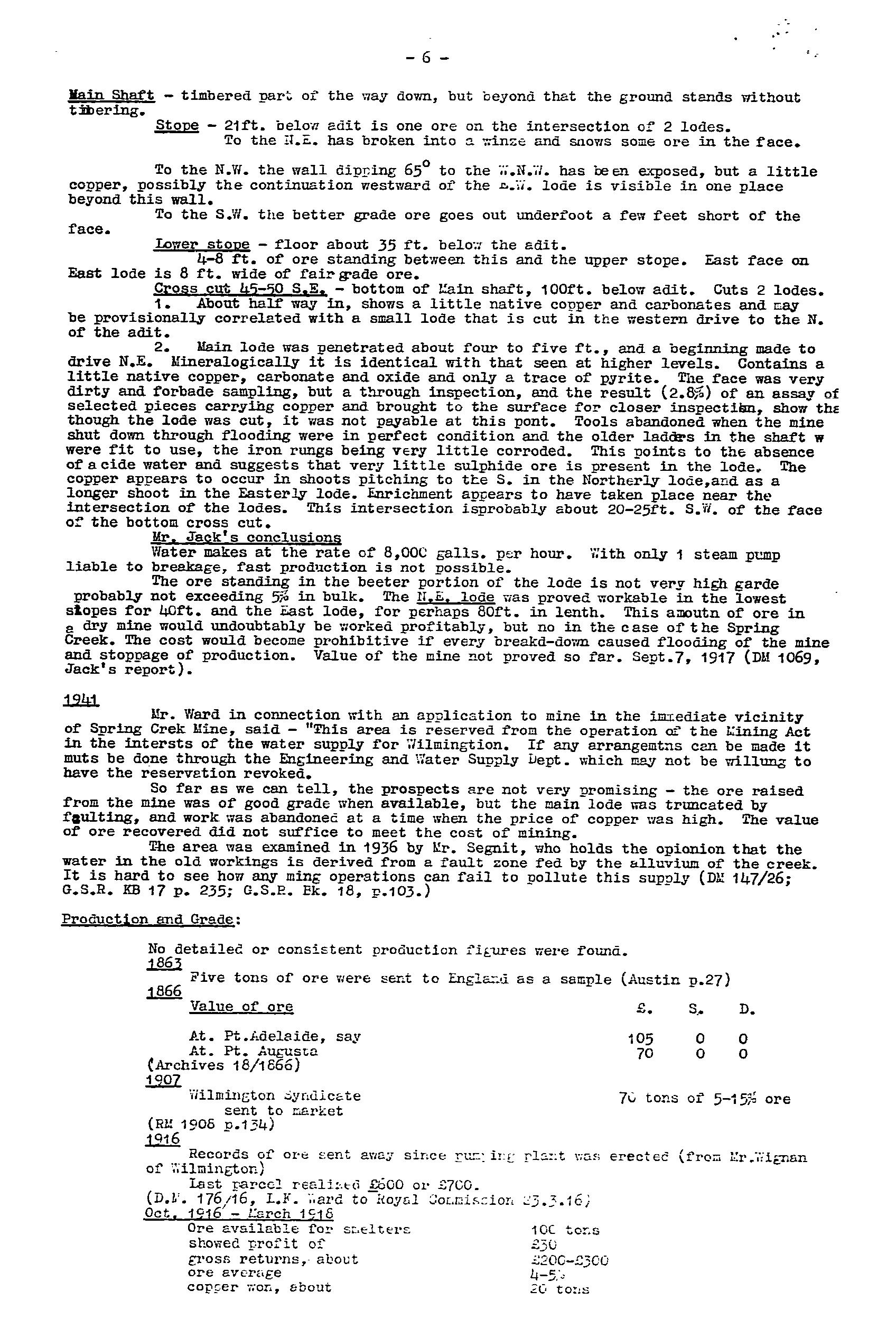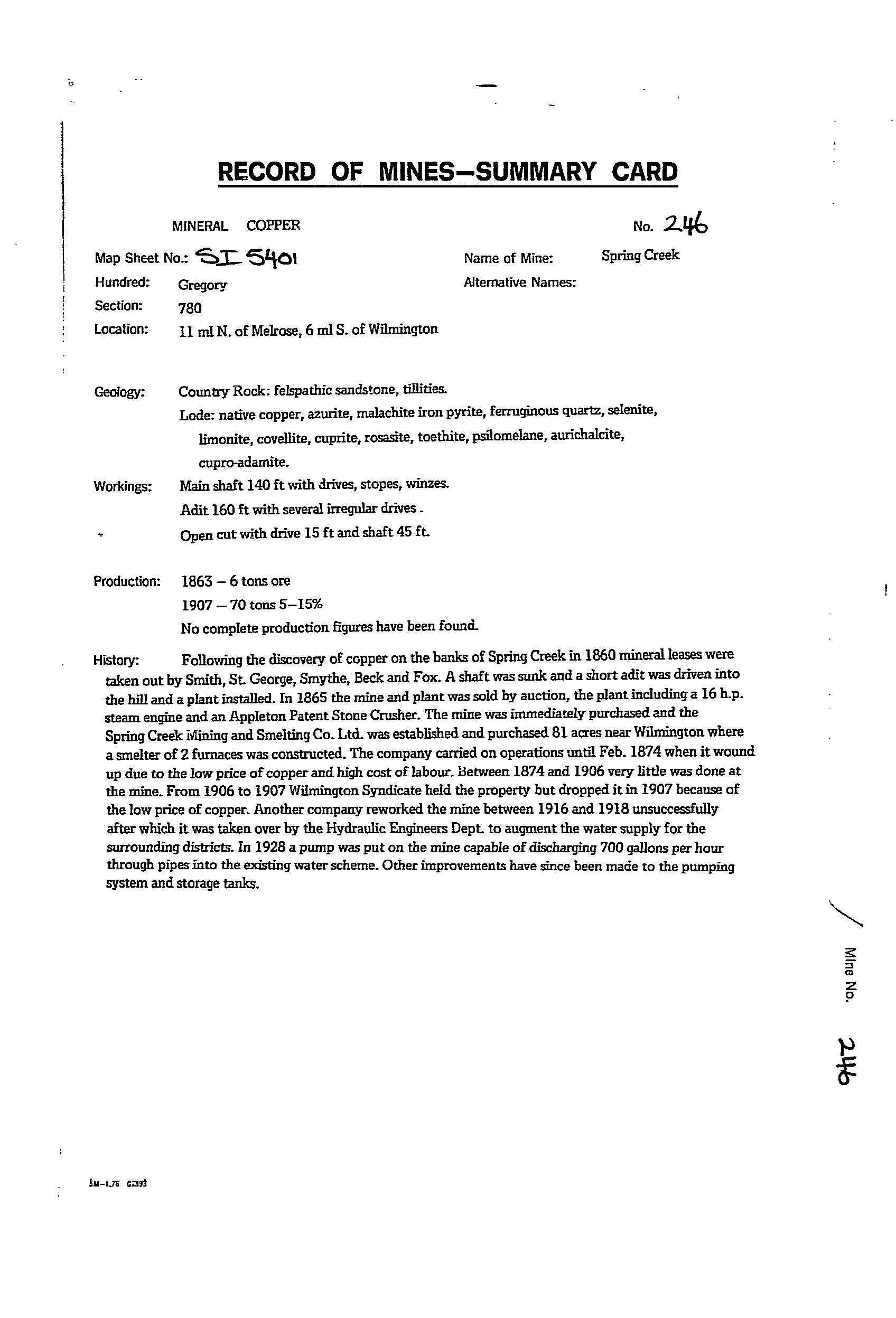 The Spring Creek Mine was worked from 1860-65 for 6.1 tonne ore. It was re-worked from 1865-74 (no production records), with activity ceased when the copper price fell. Records at the time indicate a quartz-iron oxide lode in the adit at 2m wide, with shoots and bunches of copper carbonate ore. Bulk samples taken returned values of 4.5-6.2%Cu. Mining recommenced in 1906-07 with the adit extended to 48.7m, with a 12m drive developed to the SW on a second 1.7m wide lode trend NE-SW, dip SE, and widening to 4.6m at the end of the drive. The lode was reported as a siliceous ironstone, with veins of copper carbonate, grades 4.5-8%Cu. Incomplete production records were for ~70 tonne sent to market at grades 5-15%Cu. Recovery of specimen native copper was a feature. The mine reopened from 1916-18 via further extension of the old workings. Sampling by a Government geologist returned values from 2.8–8.9%Cu. The operation folded when the pumps broke down and the mine flooded. Recorded production was ~101 tonne at 4-5%Cu. Total production from 1860-1918 is estimated at 175 tonne. The mine was subsequently used to augment the local water supply, with a pump installed in 1928. A 200,000 gallon tank was installed in 1935, with pumping rate logged as 3,000 gallons/hr. Main workings included an open cut with a 4.5m drive, and shaft to 13.7m, an adit to 48.8m with several drives, and a main shaft to 42.7m with drives, stopes, and winzes.