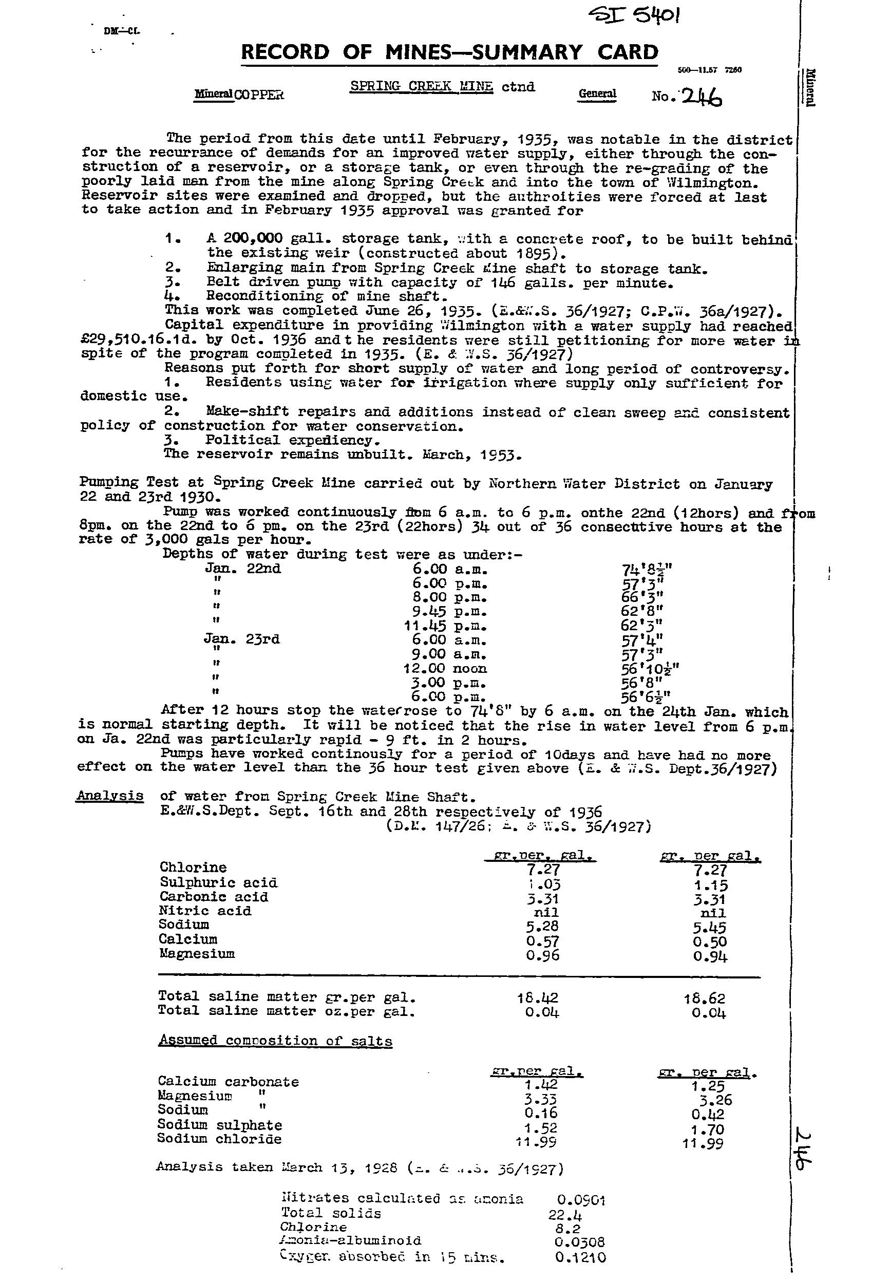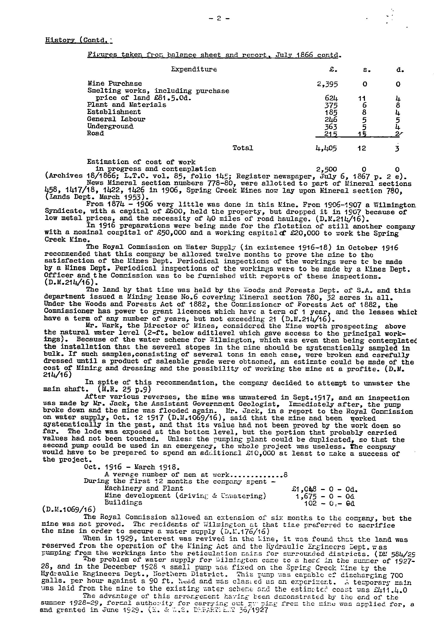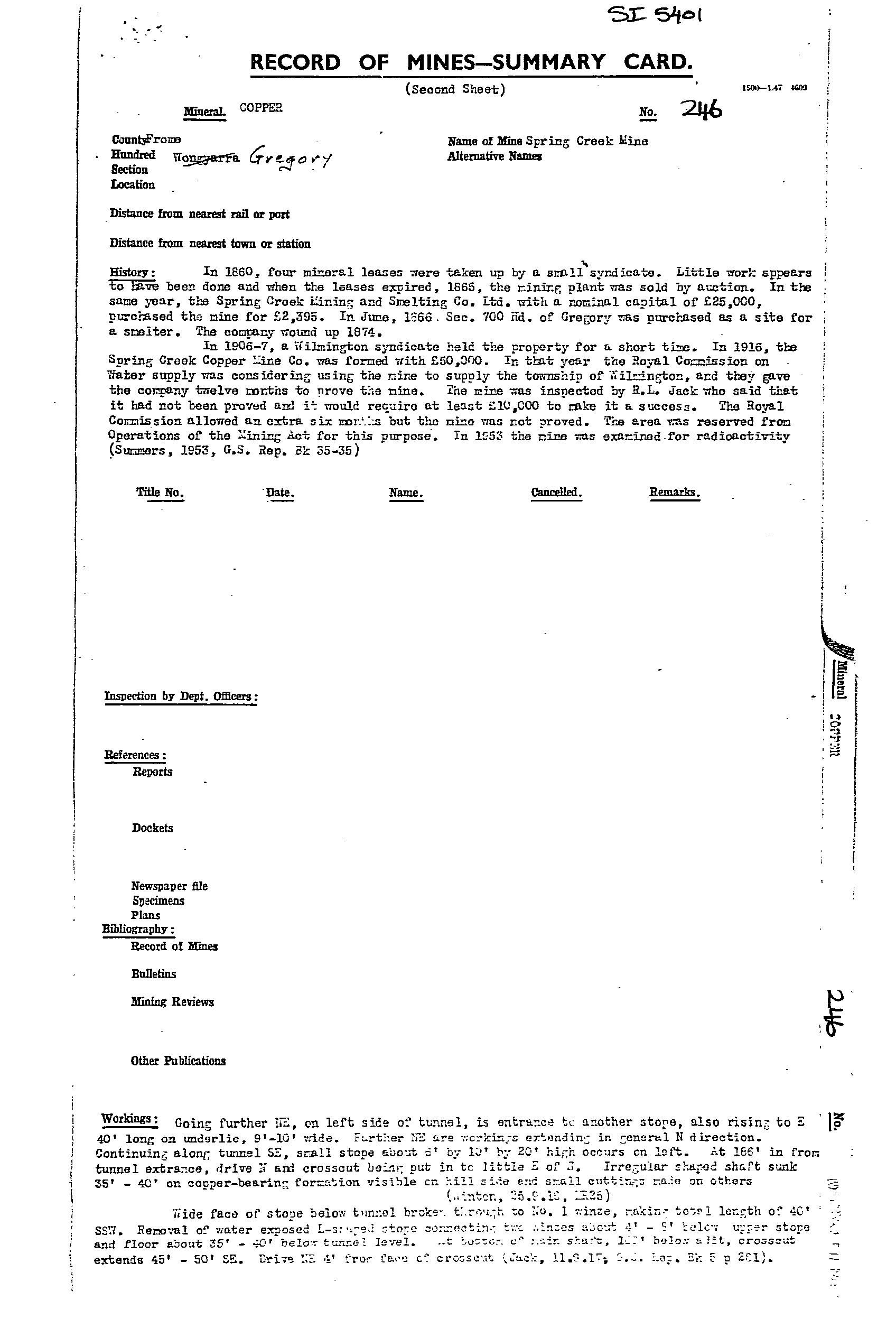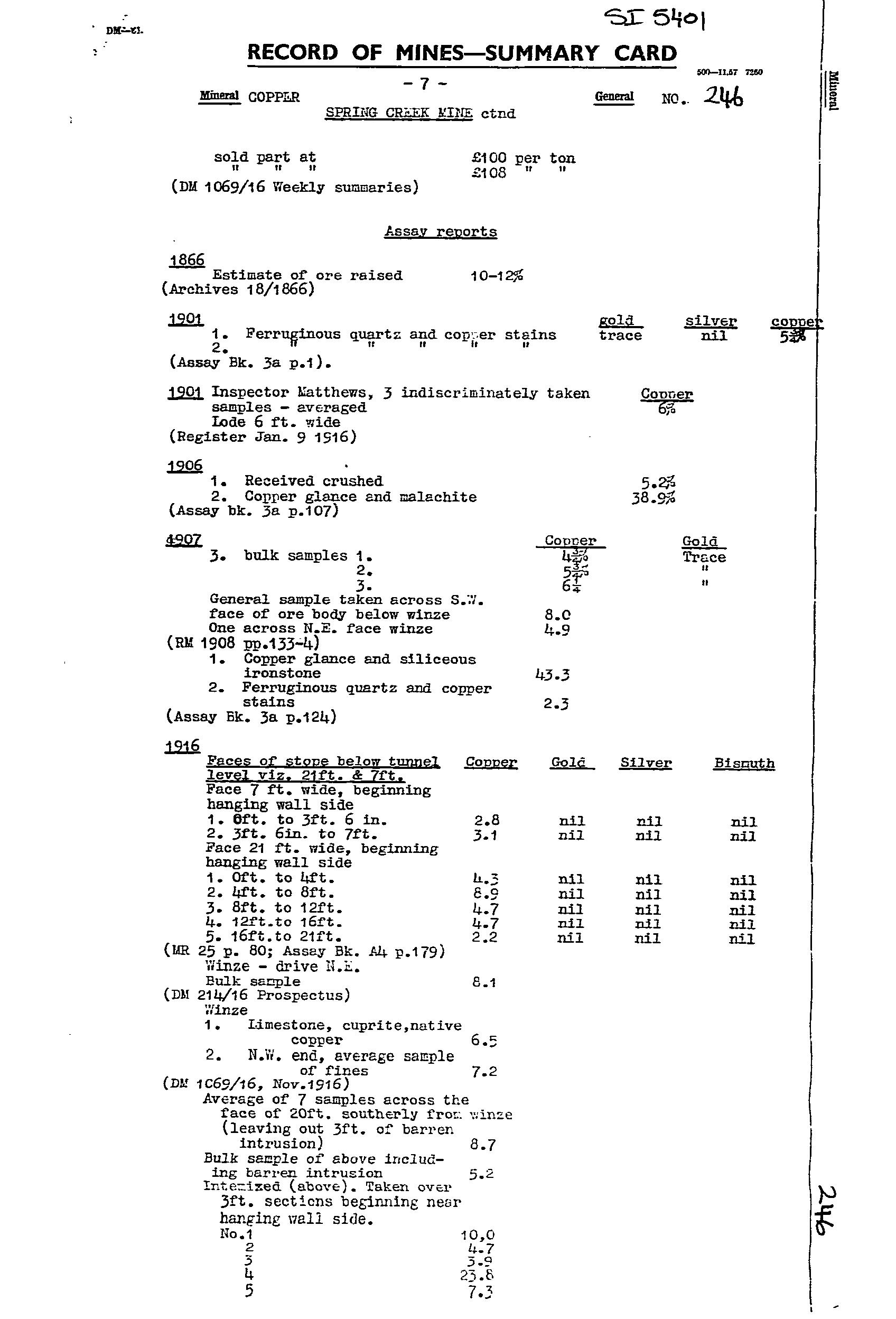 The Spring Creek Mine was worked from 1860-65 for 6.1 tonne ore. It was re-worked from 1865-74 (no production records), with activity ceased when the copper price fell. Records at the time indicate a quartz-iron oxide lode in the adit at 2m wide, with shoots and bunches of copper carbonate ore. Bulk samples taken returned values of 4.5-6.2%Cu. Mining recommenced in 1906-07 with the adit extended to 48.7m, with a 12m drive developed to the SW on a second 1.7m wide lode trend NE-SW, dip SE, and widening to 4.6m at the end of the drive. The lode was reported as a siliceous ironstone, with veins of copper carbonate, grades 4.5-8%Cu. Incomplete production records were for ~70 tonne sent to market at grades 5-15%Cu. Recovery of specimen native copper was a feature. The mine reopened from 1916-18 via further extension of the old workings. Sampling by a Government geologist returned values from 2.8–8.9%Cu. The operation folded when the pumps broke down and the mine flooded. Recorded production was ~101 tonne at 4-5%Cu. Total production from 1860-1918 is estimated at 175 tonne. The mine was subsequently used to augment the local water supply, with a pump installed in 1928. A 200,000 gallon tank was installed in 1935, with pumping rate logged as 3,000 gallons/hr. Main workings included an open cut with a 4.5m drive, and shaft to 13.7m, an adit to 48.8m with several drives, and a main shaft to 42.7m with drives, stopes, and winzes.