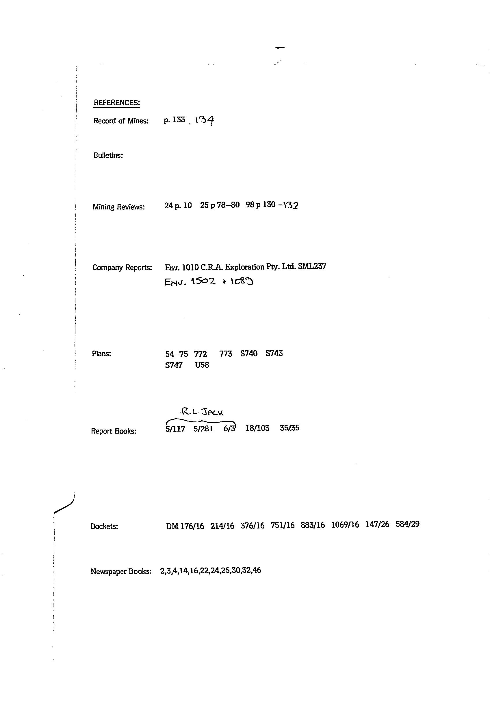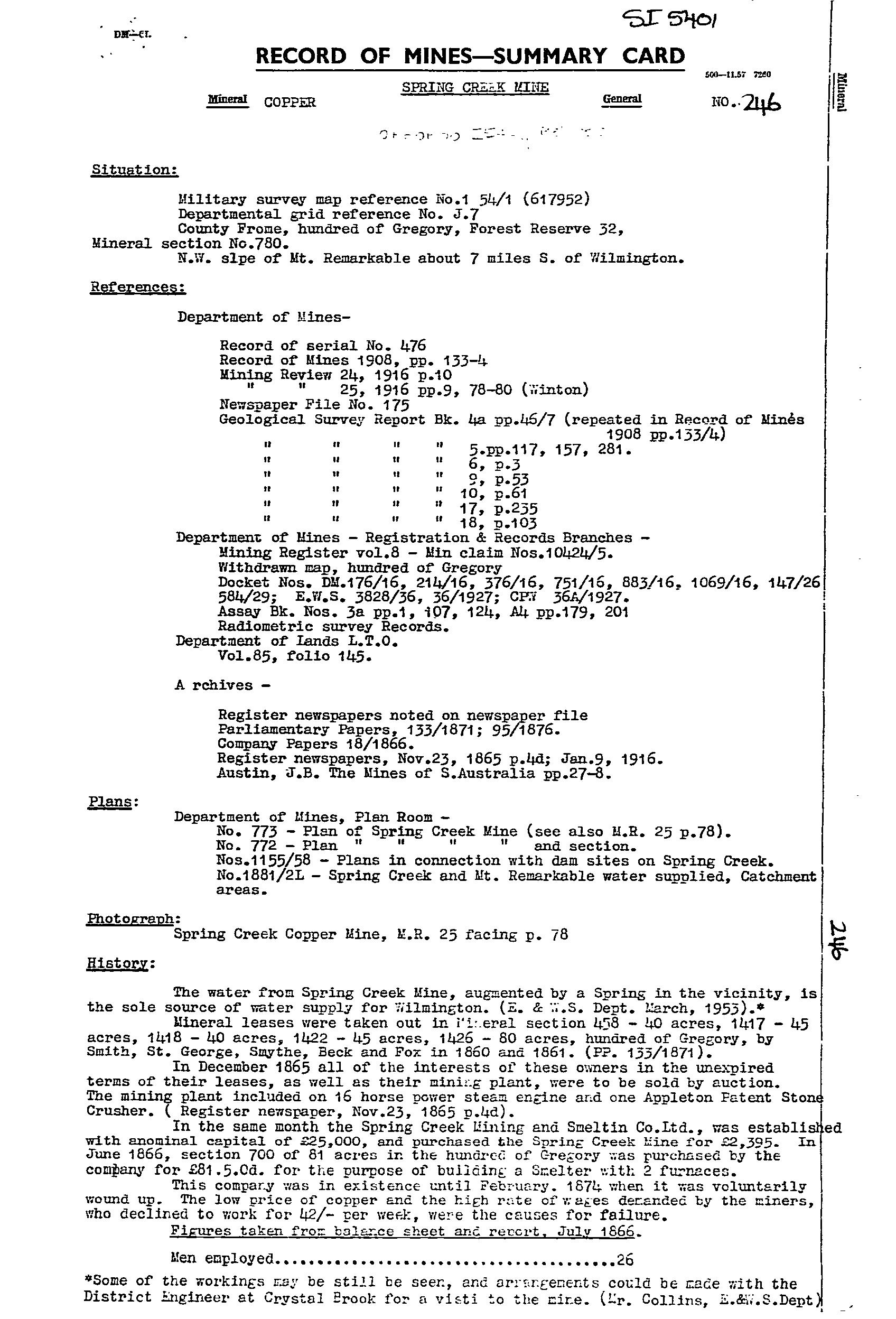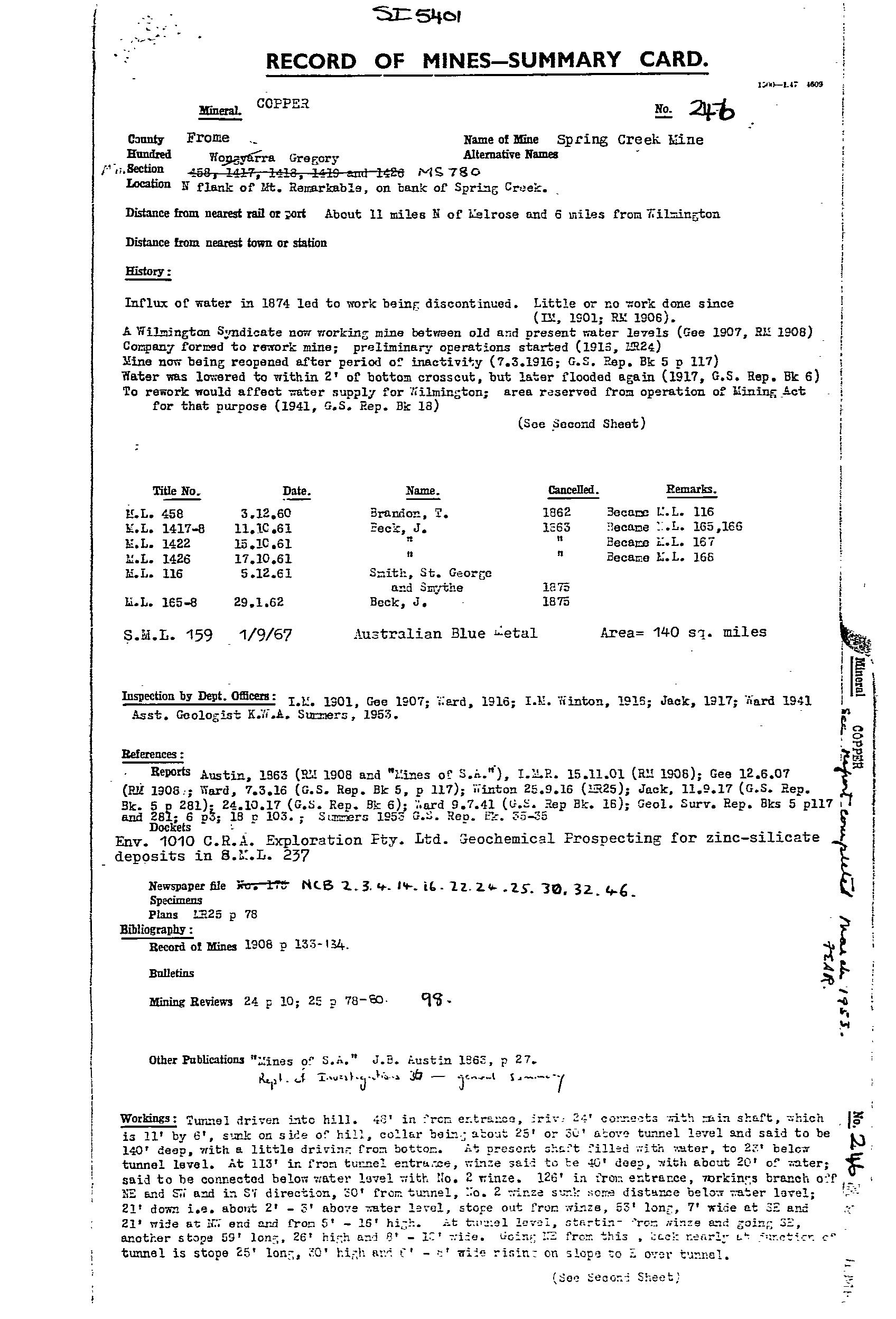 SPRING CREEK, quartz-iron oxide reef with copper mineralisation discovered in 1860. A persistent lode horizon can be traced for a considerable distance south along strike. Traces of sporadic mineralisation can be followed along the western edge of Mt. Remarkable Range to approximately the same stratigraphic level as the Willowie Manganese Wads (mindep # 6292), ~5km to the south.