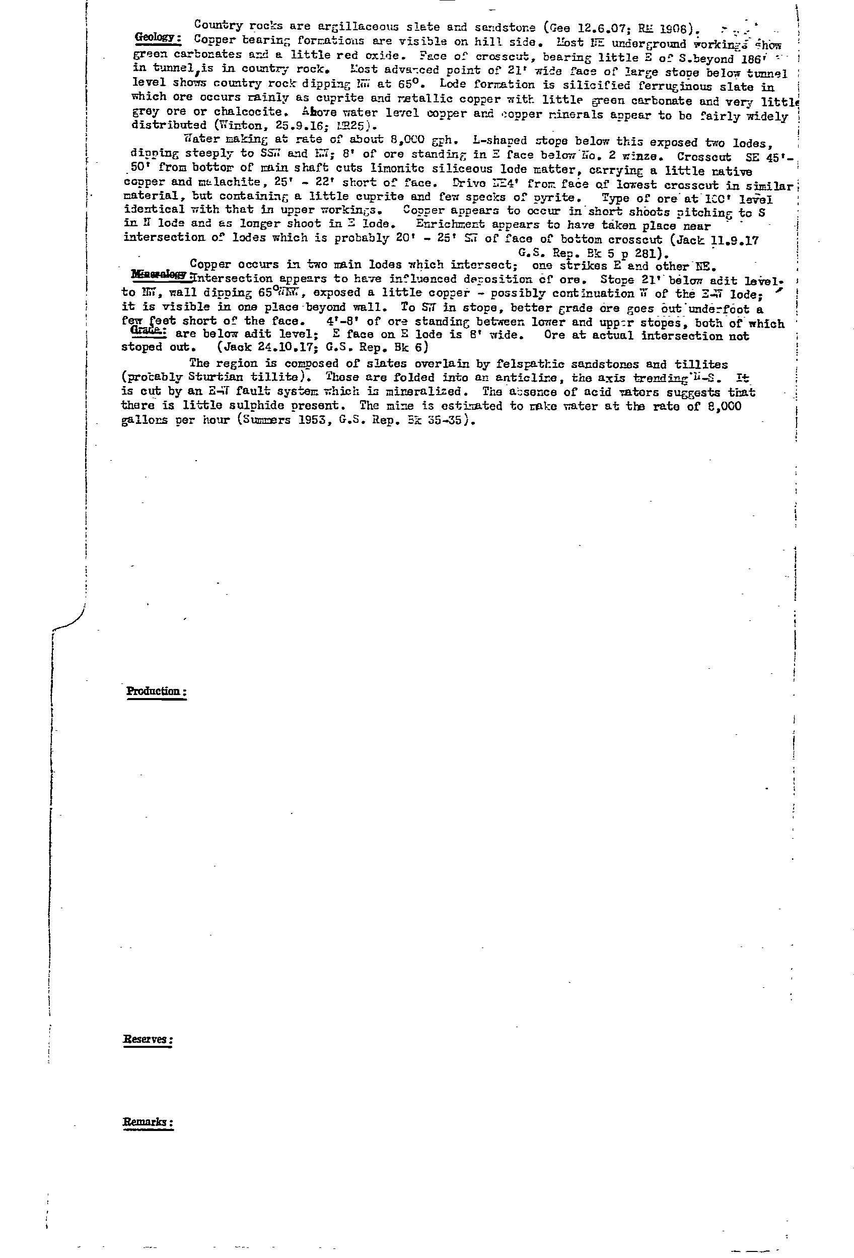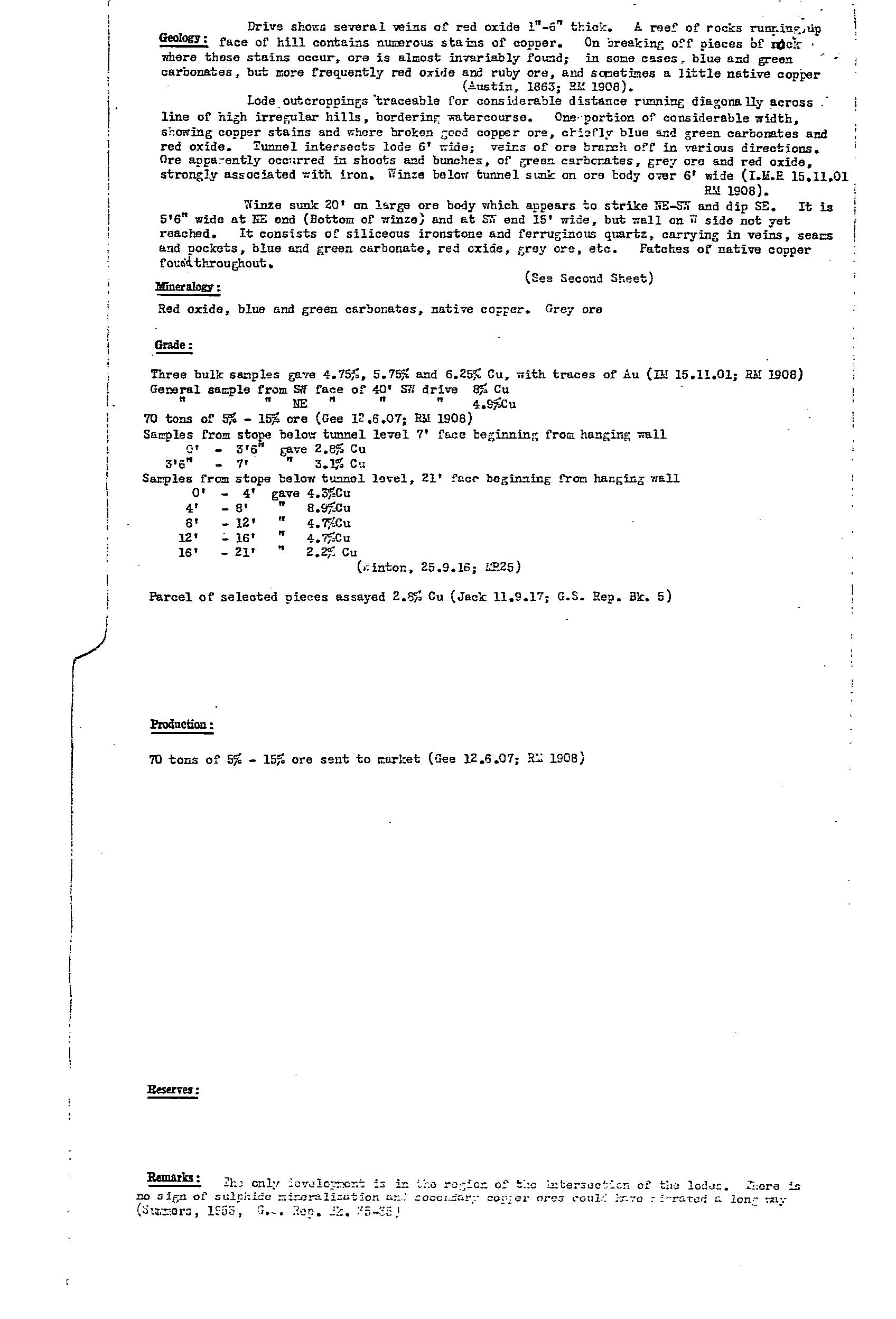 persistent quartz-iron oxide reef carrying copper mineralisation for recovery of ~175 tonne of hand picked ore. Host was tillite of the Emeroo Subgroup. Diamond drill hole identified oxidised lode at depth.