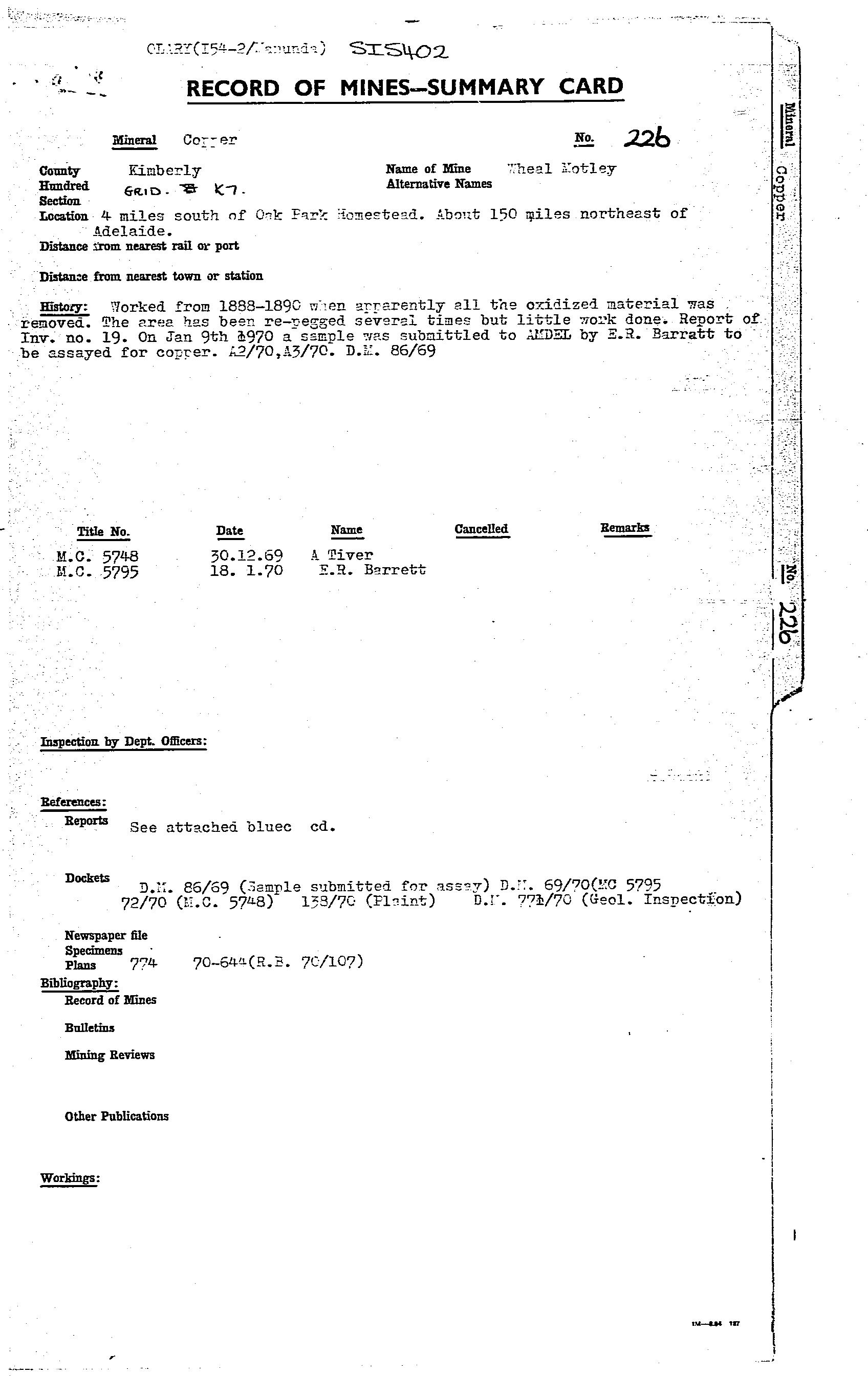WHEAL MOTLEY, located on the northern spur of the Pualco Range about 6.5 km south of Oak Park homestead. Workings comprise an alignment of shallow excavations, trenches, shafts, paralleling a local 060 structural trend. Host rocks are fine grained, pebbly metasediment and include clay and quartzite interbeds of the Pualco Tillite, severely disrupted by broad warping and local faulting.