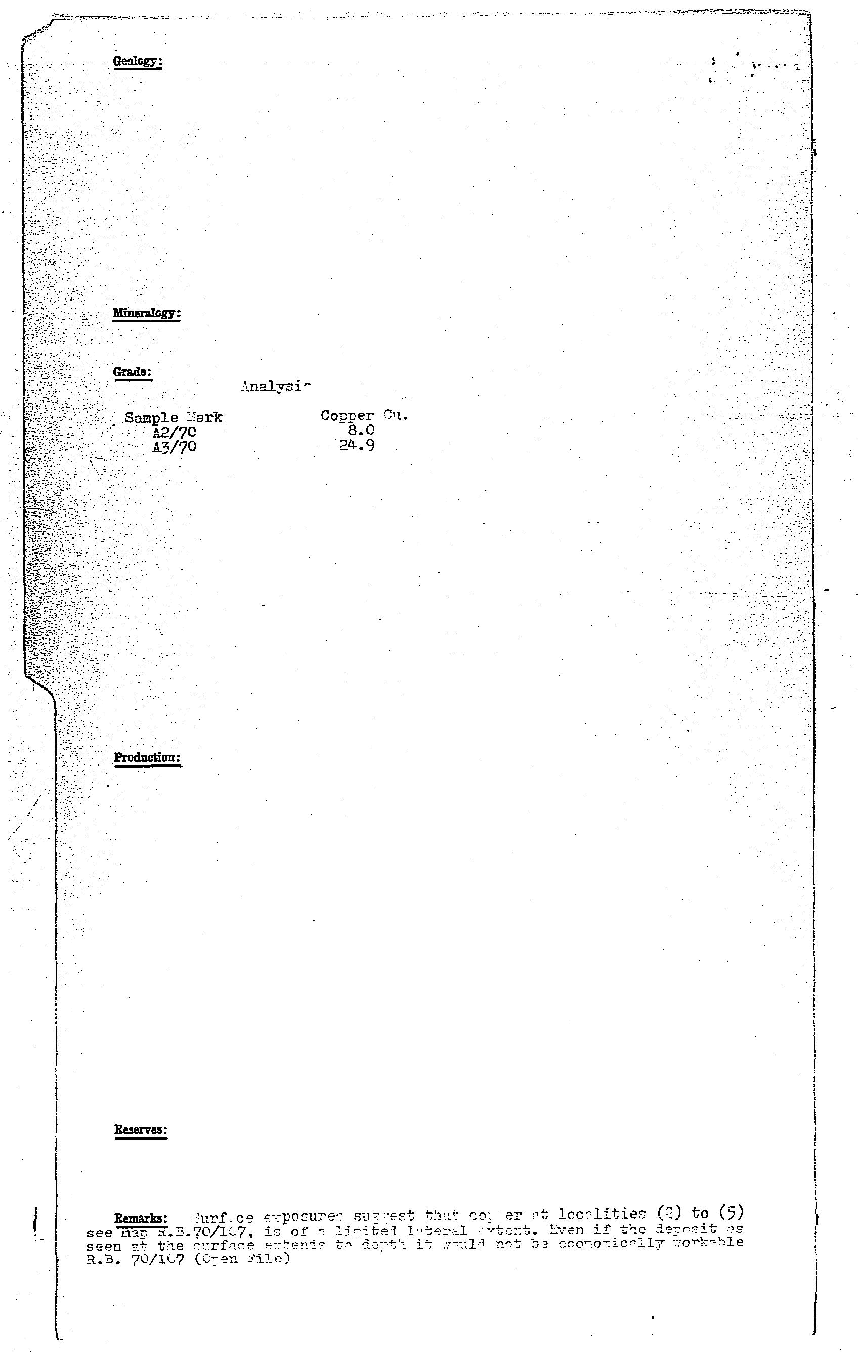 Supergene copper mineralisation is evident as extensive copper oxide staining accompanied by much malachite and azurite. One quartzite bed contains disseminated chalcocite. Results of sampling returned up to 5% Cu, with 560 ppm As, and negligible gold and silver. 2 mineralised veins trending 045, dipping NW, are ~10 cm wide, with veinlets branching off, dipping at 15. Barren tension gashes trend 330.